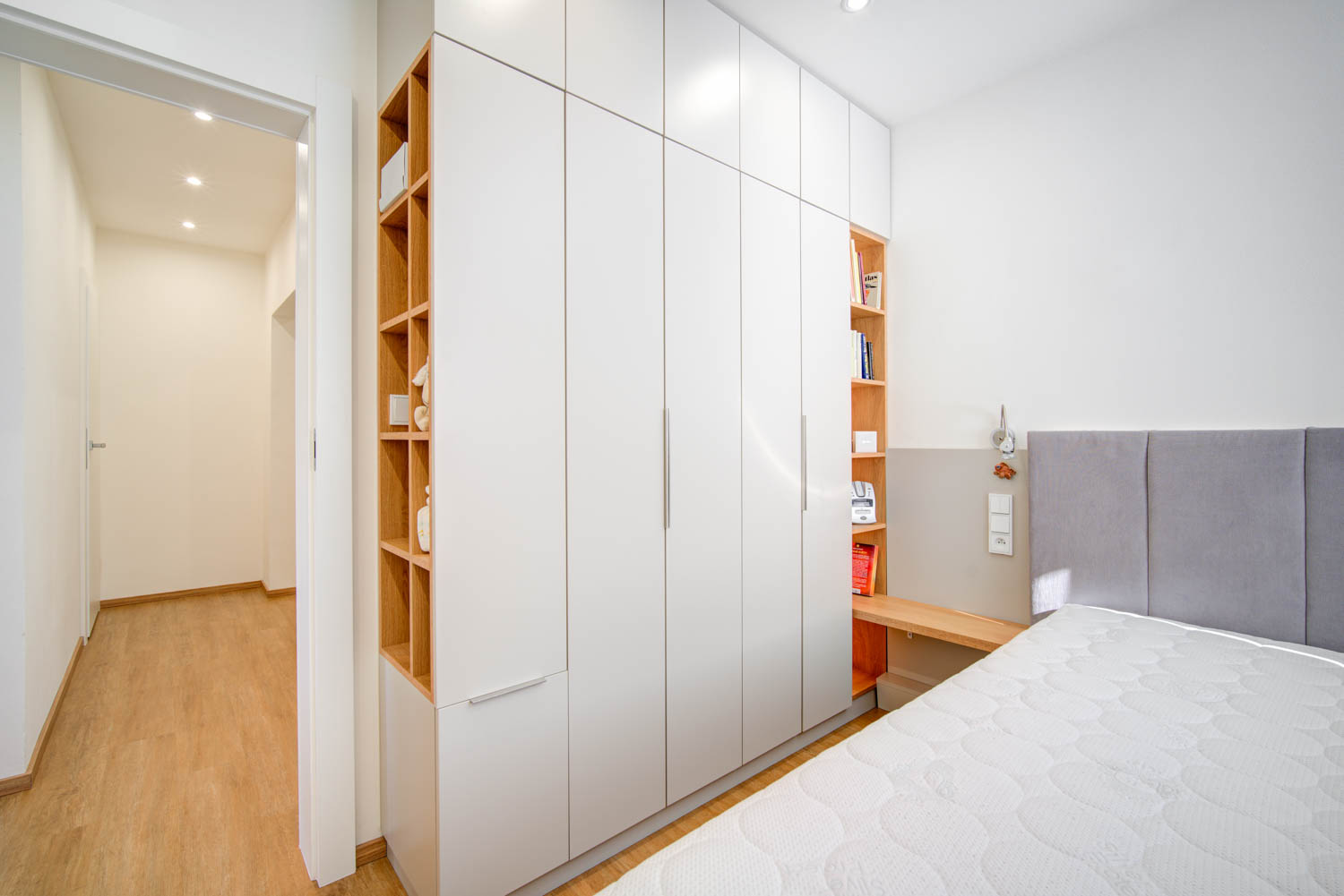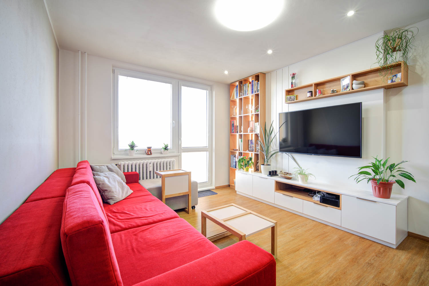 Základní barevnou paletu bílá – šedá – přírodní dub doplnila v detailech výraznější červená (na záchodě a koupelně v podobě skříňky, v obývacím pokoji pak v podobě pohovky). Pro potřeby stále aktuálnějšího „home officu“ jsme do obývacího pokoje umístili pracovní kout s úložným prostorem na kancelářské potřeby. Kuchyň díky světlým barvám skříněk a využití až po strop získala dostatečný úložný prostor a opticky se zvětšila. Kombinace šedé s dubem působí minimalisticky, přitom útulně. Využili jsme i sebemenší prostor, například mezi lednici a kuchyňskou linku se vlezla úzká skříň s vysouvacími policemi pro lepší přehlednost.