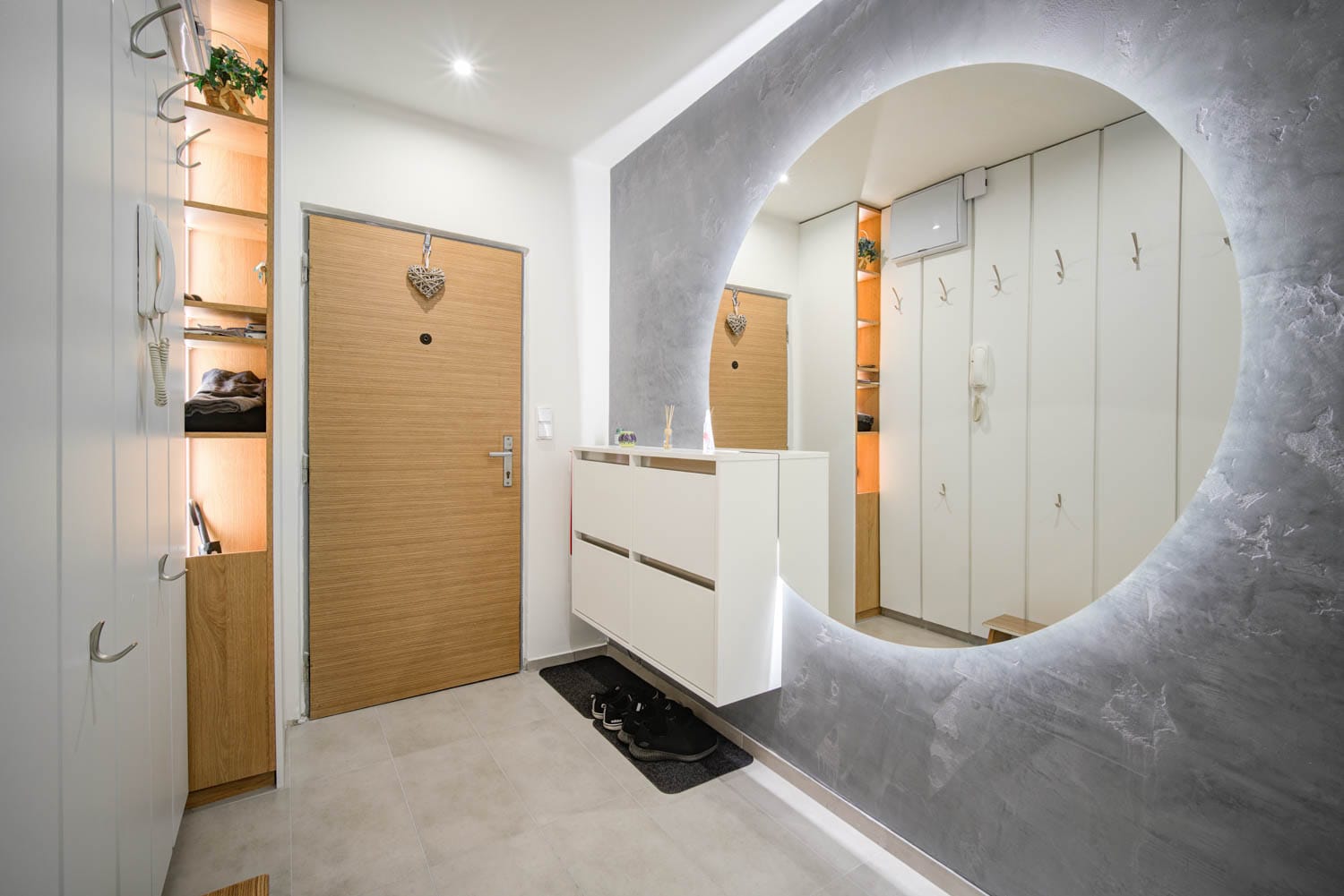 Nejvíc ale prokoukla původně malá tmavá, až klaustrofobicky působící, předsíň. Díky světle šedé, bílé a obrovskému kulatému zrcadlu je prostor světlý a provzdušněný. První místo, kam po otevření dveří vstoupíte, vám hned odhalí, v jakém stylu a jakých barvách je laděn celý byt. A to tak to má být.