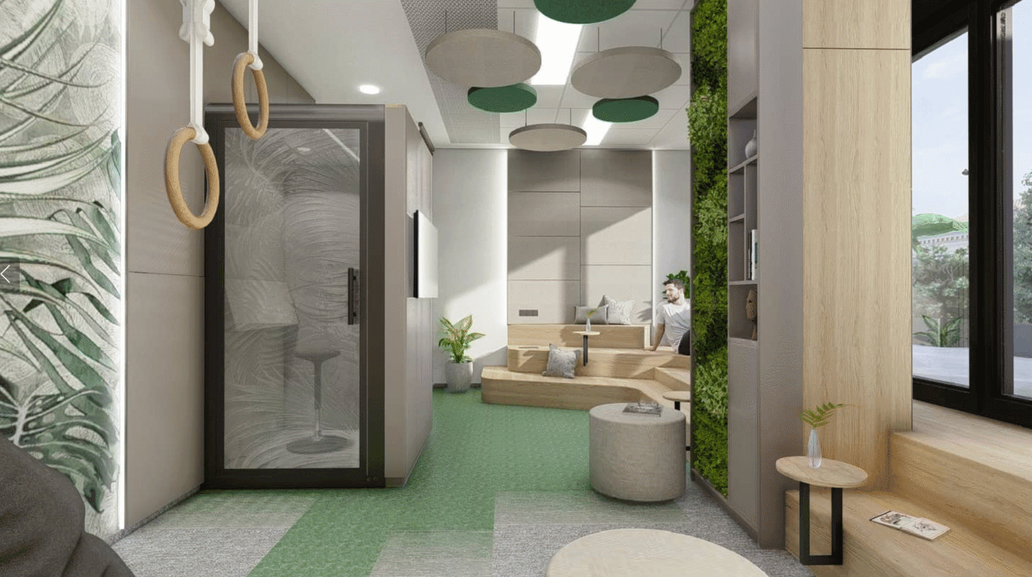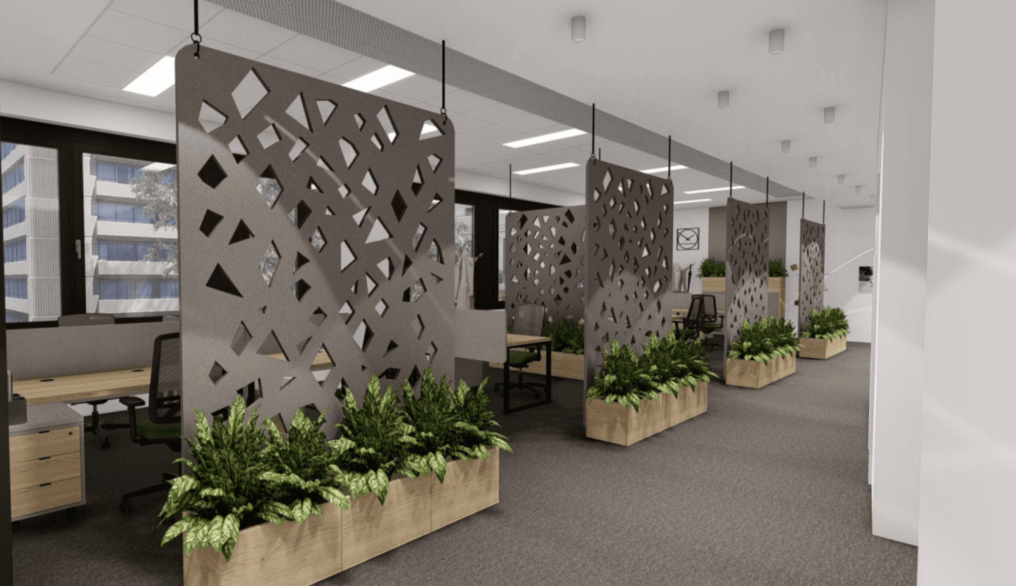 Interiér pracuje s polopropustnými paravány a integrovanou zelení, které rozbíjejí šíření zvuku v open-space, takže prostor zůstává vizuálně otevřený, ale akusticky klidný a umožňuje soustředěnou práci bez rušivého hluku.