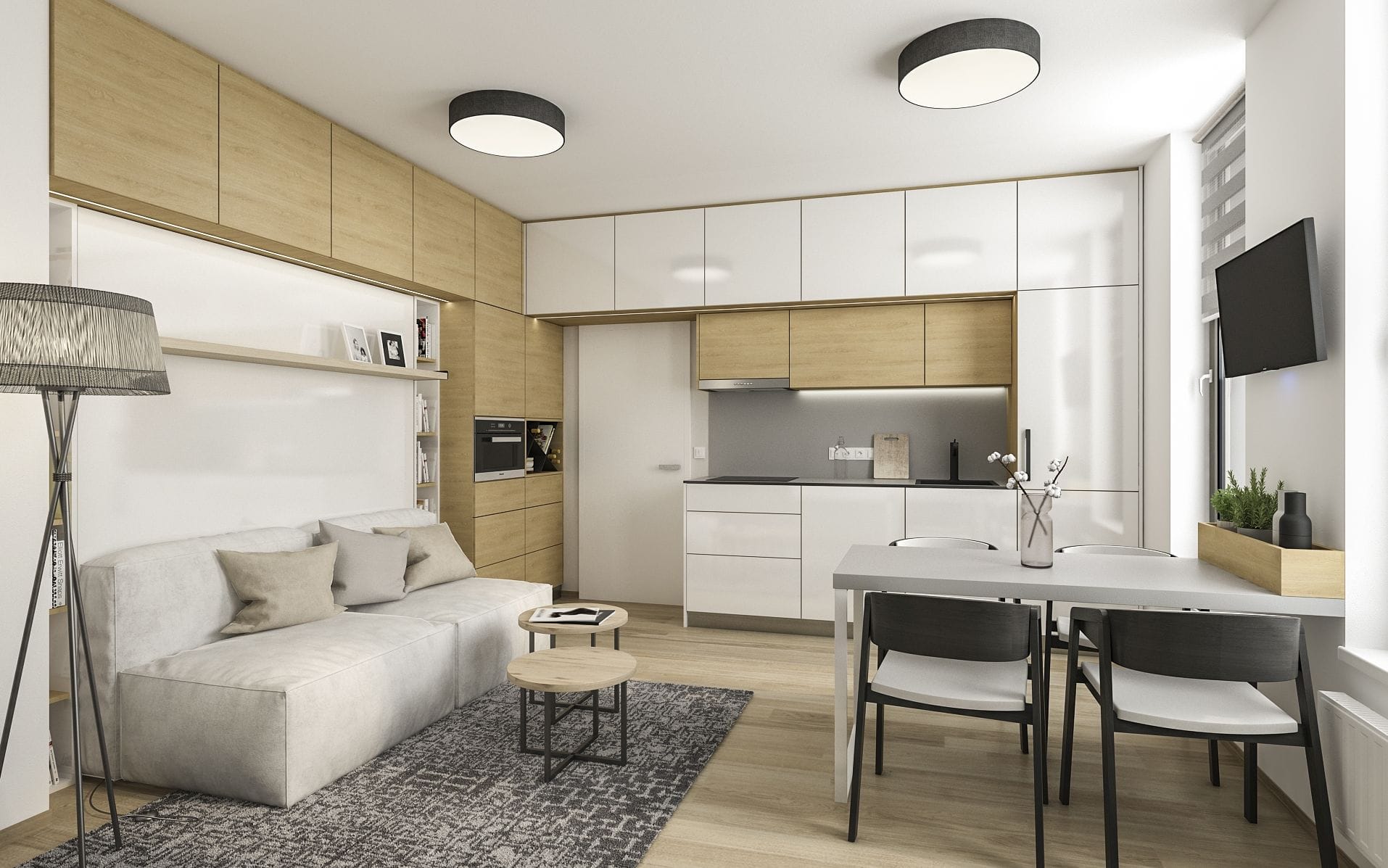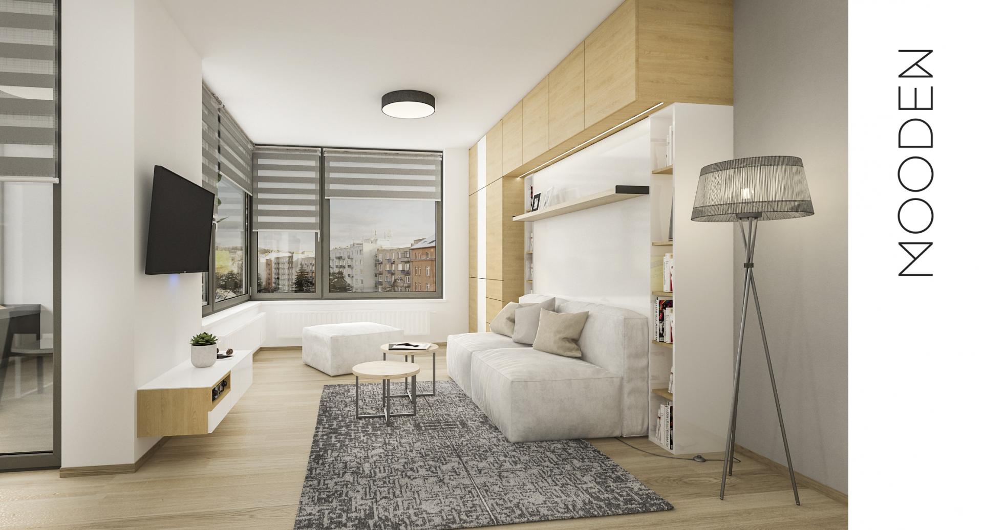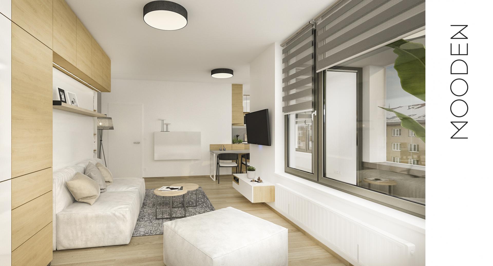 Pro developerský projekt jsme připravili vizualizace několika malometrážních bytů v bytovém domě, které ukazují, že i garsonka může být elegantní, útulná a maximálně funkční. Každý byt má jiný půdorys a výměru, přesto je spojuje jeden klíčový princip – nábytek vyrobený na míru, který umožňuje dokonale využít každý centimetr prostoru.