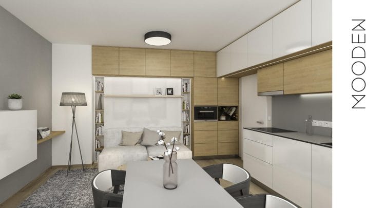 Spaní je ve všech bytech řešeno rozkládací postelí, která se ve složeném stavu promění v pohodlnou pohovku. Ta je součástí vestavné stěny, která plní i další úložné funkce a zároveň působí esteticky čistě. Kuchyňské linky jsme navrhli vestavěné, aby plynule zapadly do celkového konceptu a nezabíraly zbytečně místo.
