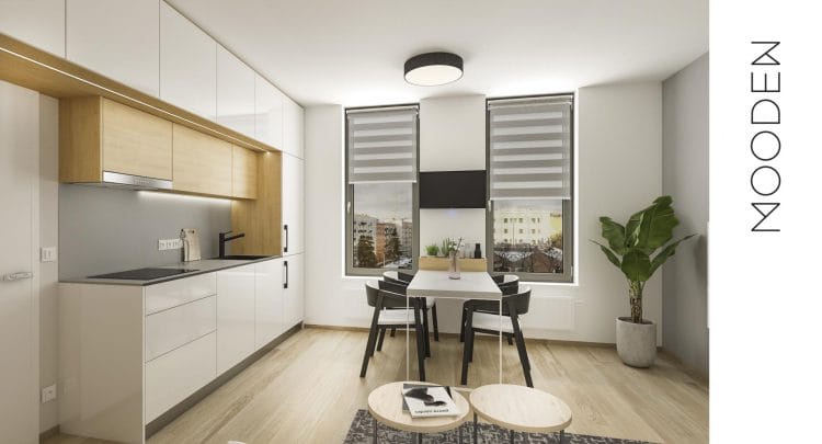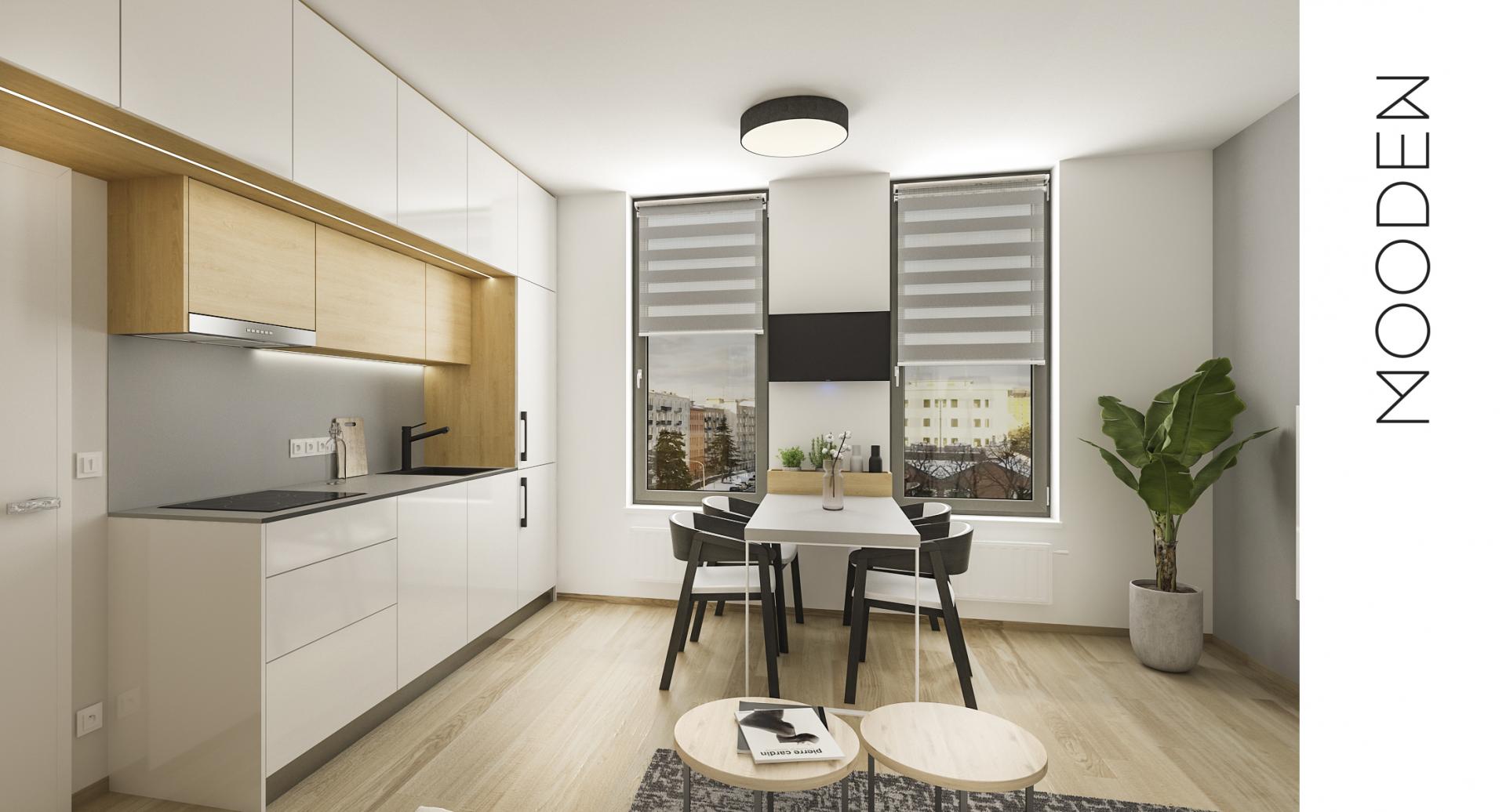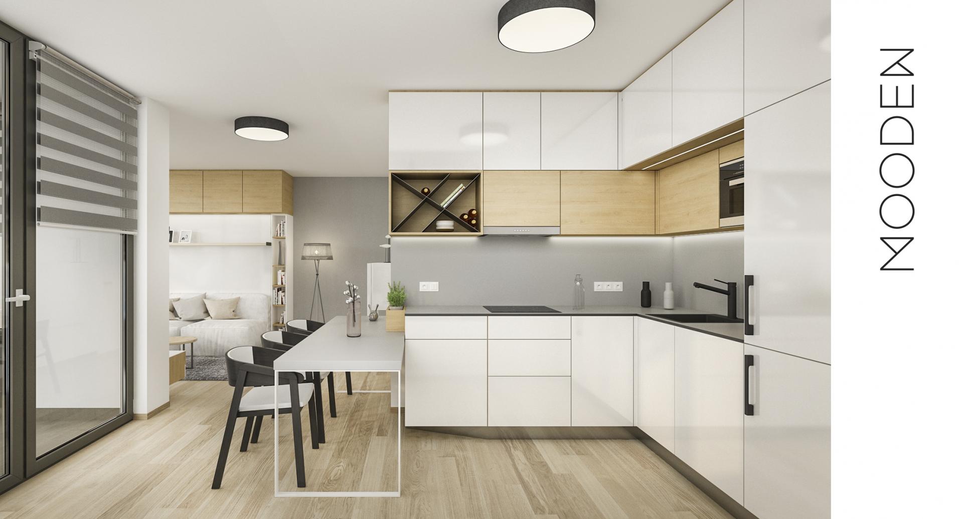 Celý interiér se nese v duchu jednoduché elegance a skandinávského designu. Dominují kombinace bílé, šedé a antracitové barvy se světlým dřevem, které společně vytvářejí nadčasový a svěží vzhled. Díky tomu jsou byty i přes svou kompaktní velikost příjemným a praktickým místem pro život.