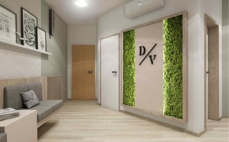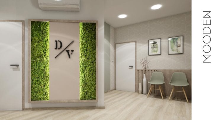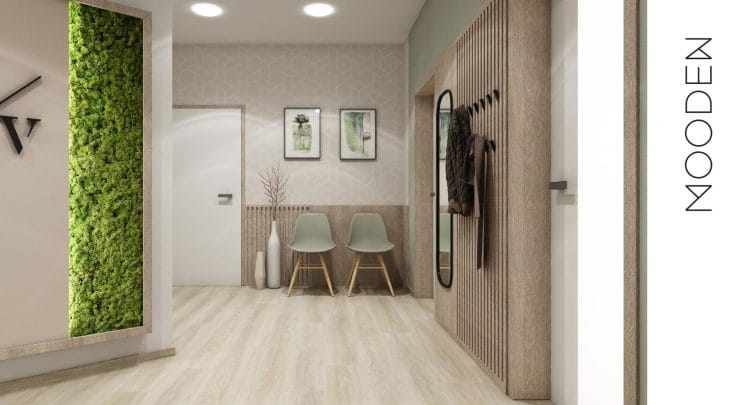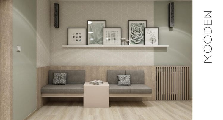 Pro čekárnu v zubní ordinaci jsme připravili vizualizaci interiéru, který navozuje klidnou a přívětivou atmosféru. Tlumená barevnost v kombinaci s čalouněným sezením a decentními tapetami vytváří útulné prostředí, v němž se pacienti cítí příjemněji. Prostor zároveň oživují mechové obrazy, které do interiéru vnášejí přírodní prvek a dodávají mu svěžest i originalitu.