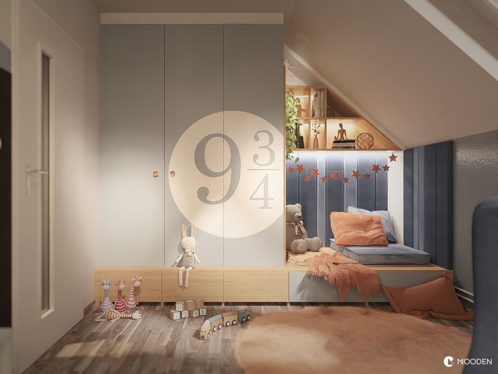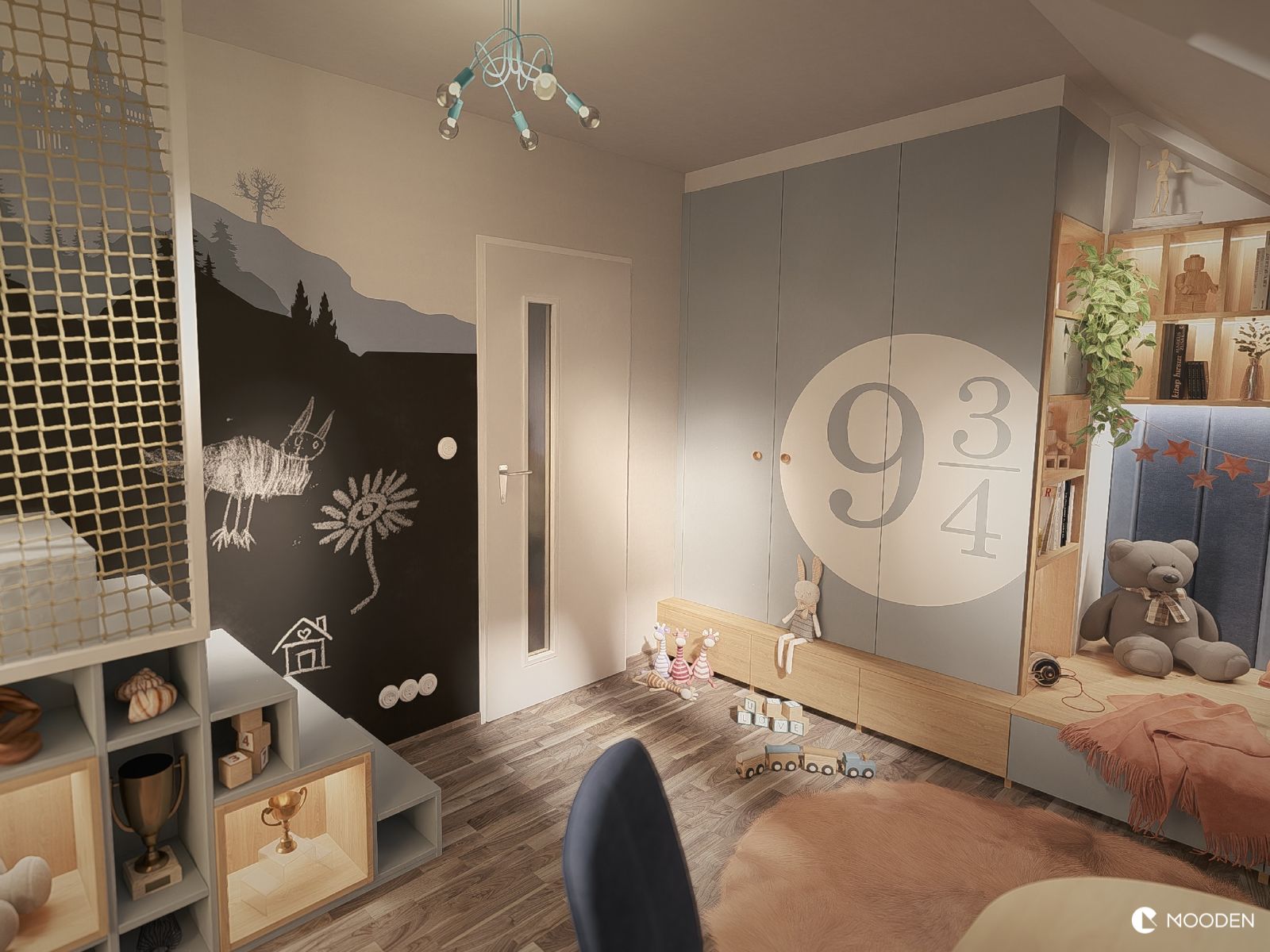 Součástí vestavěné skříně na druhé straně místnosti je i útulný koutek na sezení s matrací a polštáři. Chlapec má rád Harryho Pottera a také rád kreslí. Inspirovali jsme se motivy tohoto příběhu a také do návrhu zakomponovali kreativní koutek s popisovatelnou stěnou.