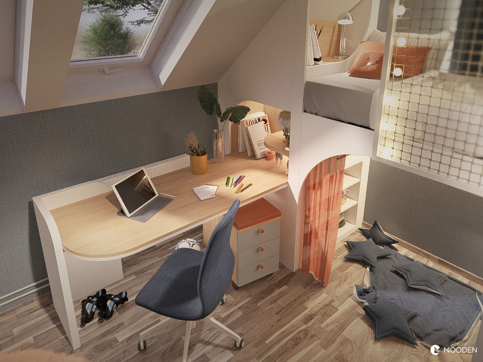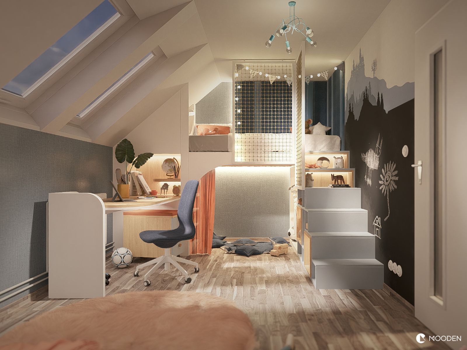 Jedno podkroví, šestiletý školák a přání rodičů, aby nový dětský pokoj sloužil i v budoucnu, až malý kluk vyroste z dětských let. Zadání bylo vytvořit nadčasový a promyšlený prostor, který malému školákovi nabídne pohodlí, dostatek místa pro hru i učení, a zároveň s ním přirozeně poroste.