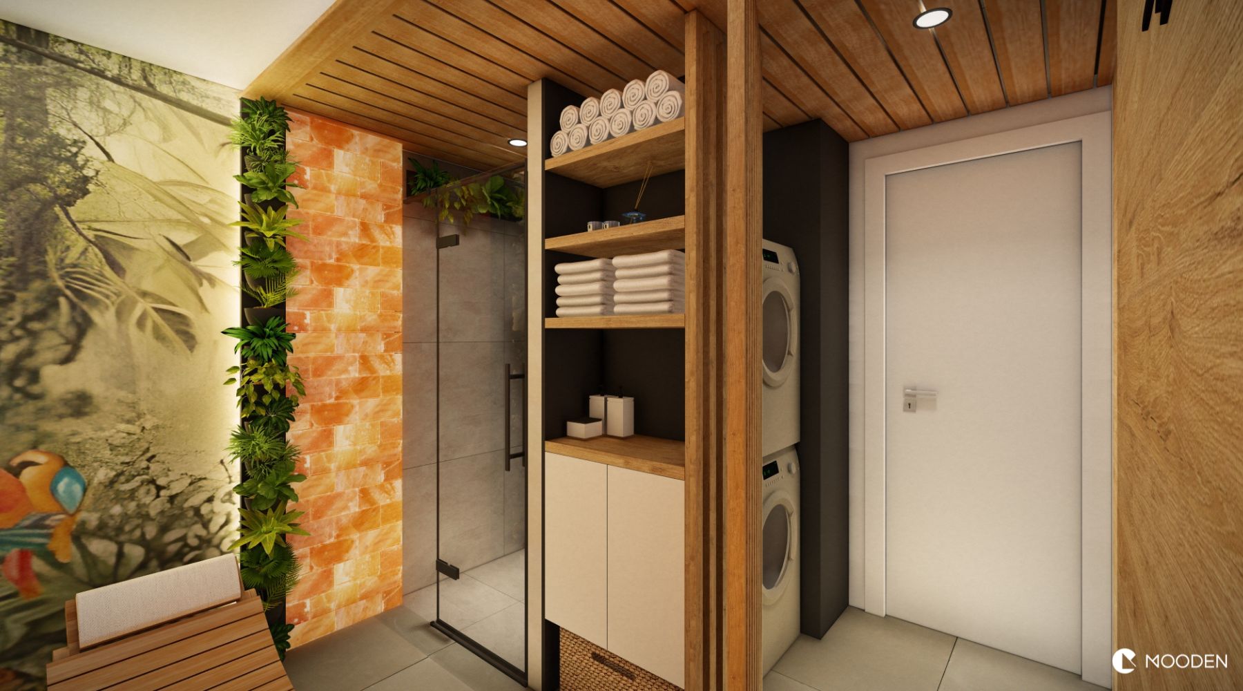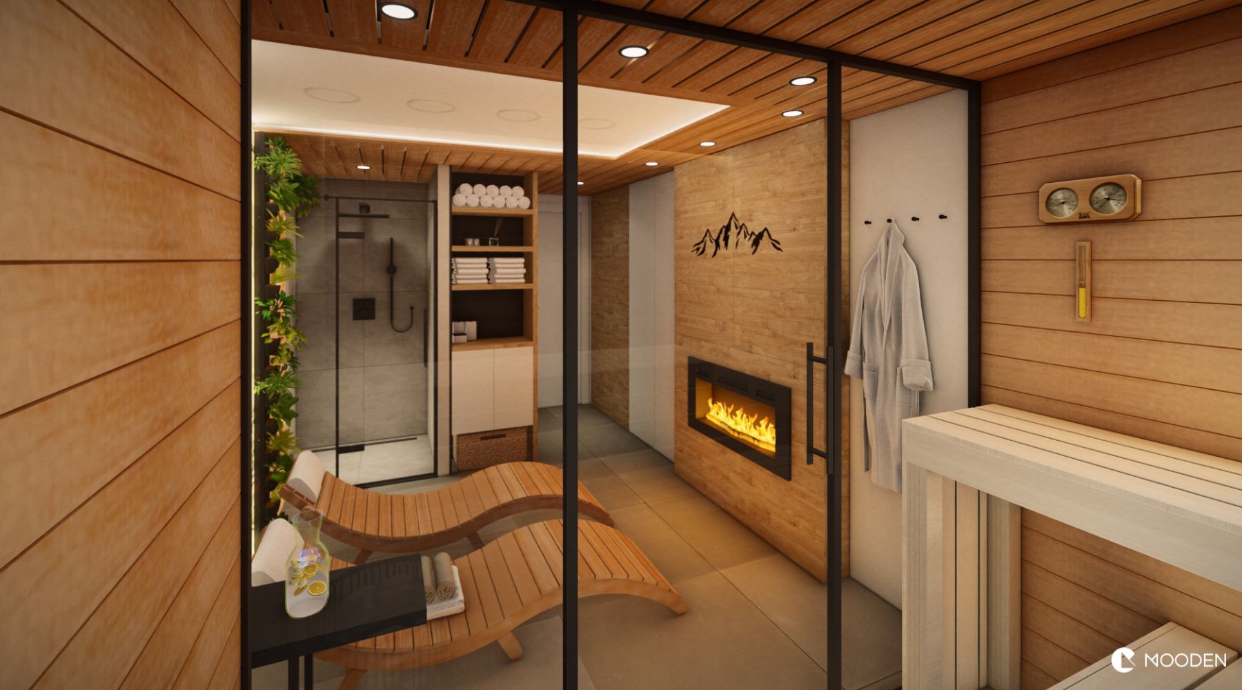 Pocit útulnosti umocňuje elektrický krb s jemně rozptýleným plamenem a tapeta s tropickým motivem, která interiéru dodává dotek exotiky. Výrazným prvkem je stěna obložená solnými cihlami. Solný obklad nejen vytváří jedinečný vizuální efekt, ale zároveň příznivě působí na dýchací cesty a celkovou regeneraci organismu.