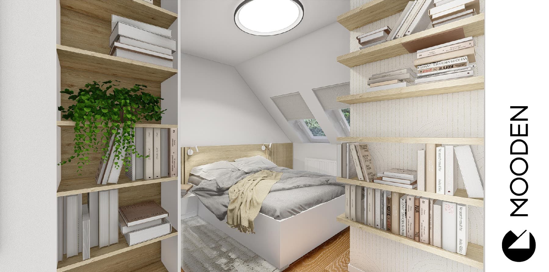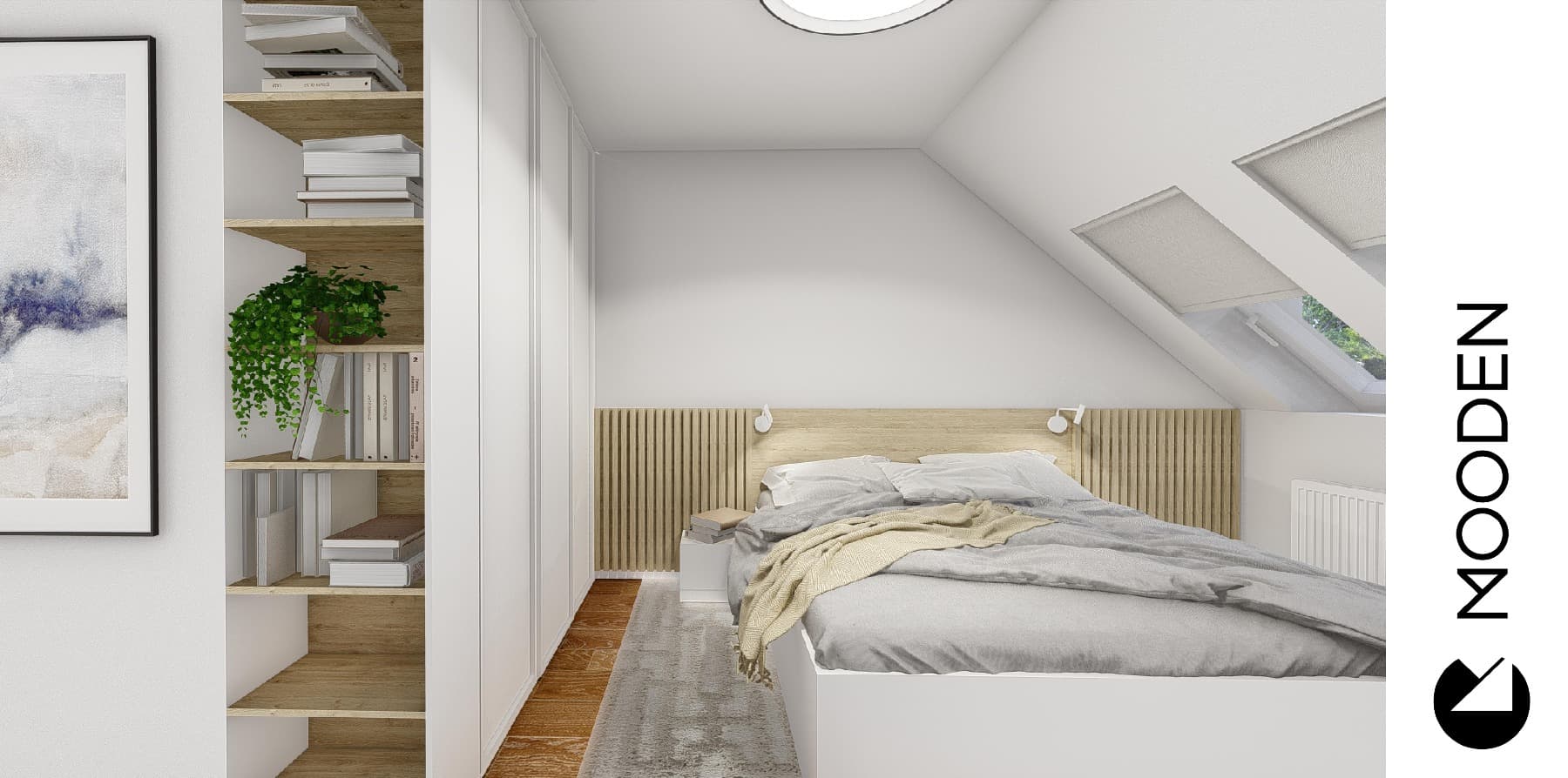 V menší podkrovní ložnici našla své místo prostorná manželská postel, úložné skříně, knihovna a důmyslný systém poliček, který maximálně využívá každé volné místo. Světlé barvy v kombinaci se dřevem dodávají ložnici pocit vzdušnosti a prostornosti.