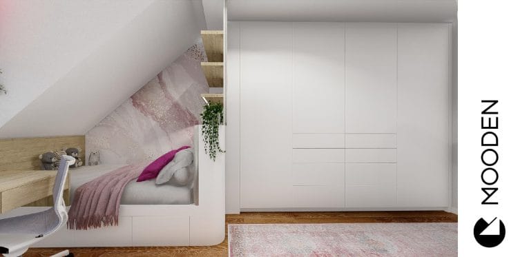 Nově navržené dětské pokoje, určené pro chlapce a dívku, mají menší rozměry. Pracovali jsme tedy na tom, abychom efektivně využili každý centimetr prostoru. Nábytek na míru zahrnuje postele s úložným prostorem a výsuvnou přistýlkou, vestavěné skříně přes celou stěnu pro uložení oblečení i hraček, a pracovní stoly s úložnými prostory, doplněné kvalitními židlemi na kolečkách. Oba pokoje ladí s oblíbenými barvami dětí – růžová pro dívku a olivová pro chlapce. Nábytek jsme přizpůsobili jejich zájmům. Do dívčího pokoje jsme zabudovali terárium pro želvy, zatímco v chlapeckém pokoji vznikl prostorný úložný prostor pro stavebnice lego.