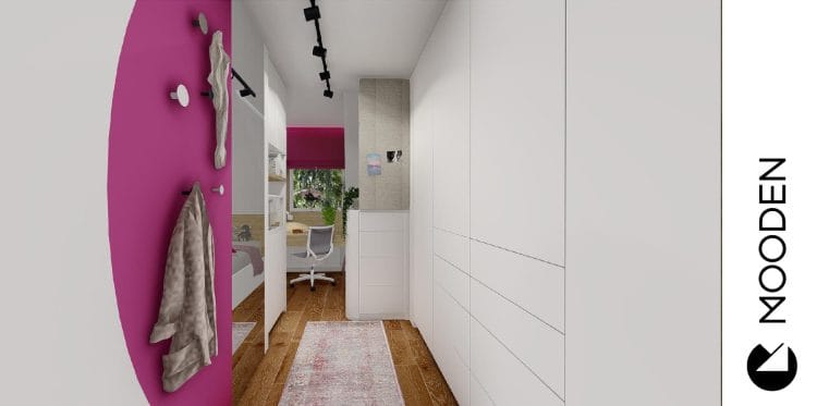 Naším úkolem bylo efektivně využít prostor velké ložnice a sousedního dětského pokoje tak, aby vznikly dva oddělené dětské pokoje a samostatná ložnice. Navrhli jsme novou dispozici místností, která zahrnovala i nezbytné stavební úpravy, jako vybourání části příčky a výstavbu nových, částečně ze sádrokartonu a částečně z nábytkových modulů. Splnili jsme také zadání, aby žádný z pokojů nebyl průchozí. Každý z pokojů má samostatný vstup ze sousední chodby a poskytuje tak všem členům rodiny plné soukromí.