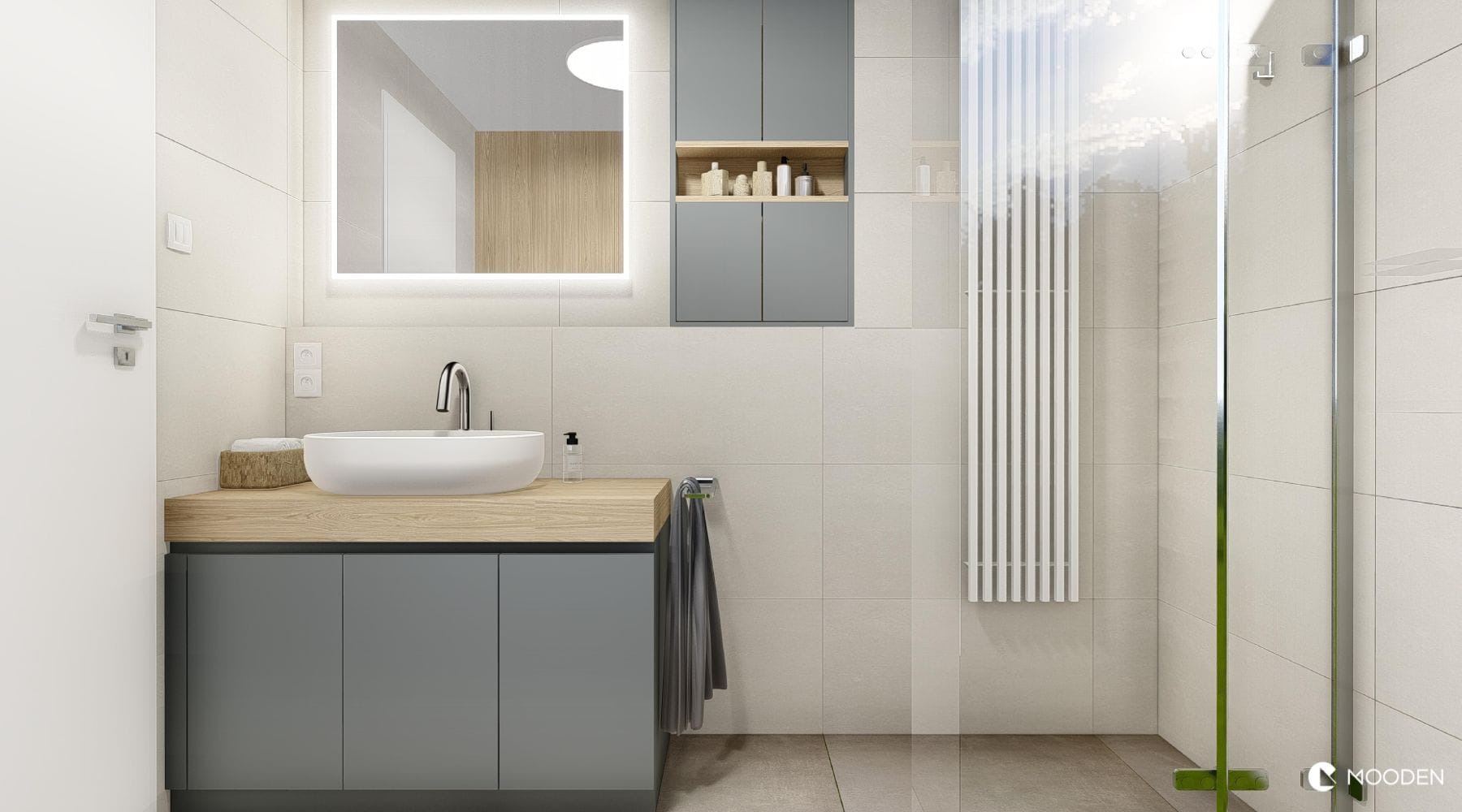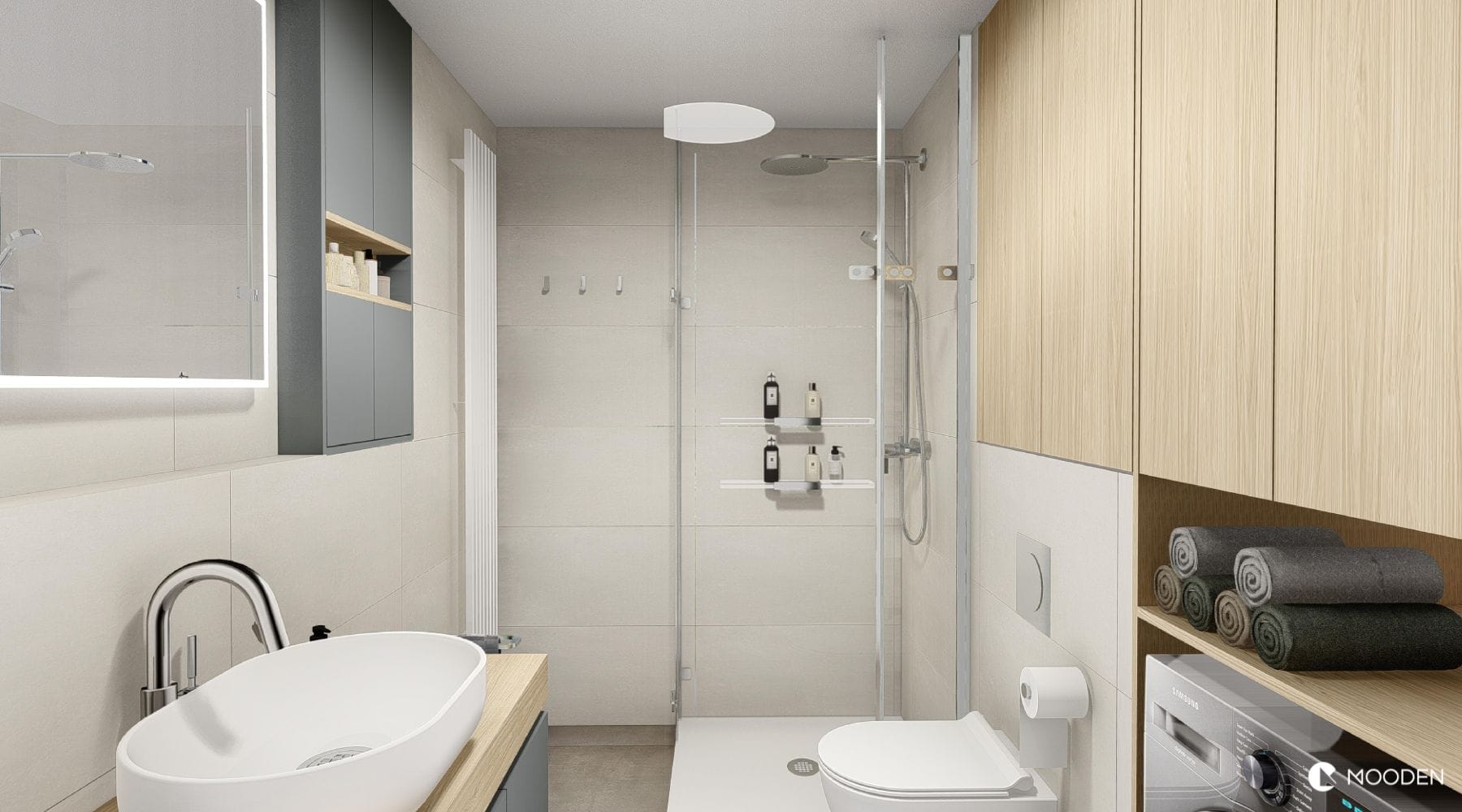 Koupelna a vstupní část bytu pokračují v duchu čistého minimalismu – vestavěné skříně skrývají pračku i sezónní věci, sprchový kout walk-in a oválné umyvadlo na skříňce působí elegantně a přehledně.