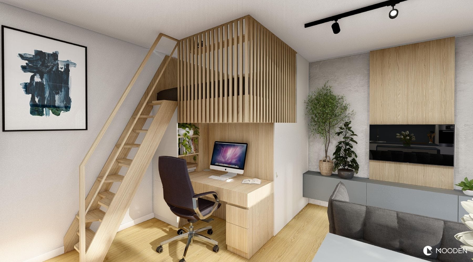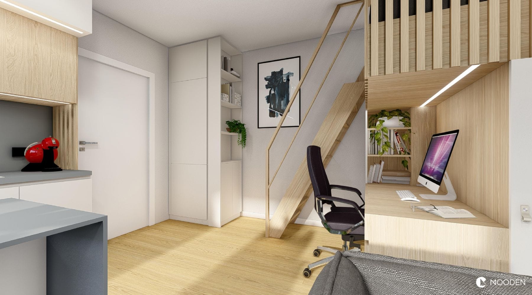 Součástí návrhu je vyvýšené patro, které slouží jako ložnice, ve spodní části jsou vestavěné úložné prostory a plnohodnotné pracovní místo. Do patra vedou úsporné mlynářské schody. Díky chytrému rozvržení zůstává interiér vzdušný, a přesto nabízí překvapivě mnoho úložného prostoru.