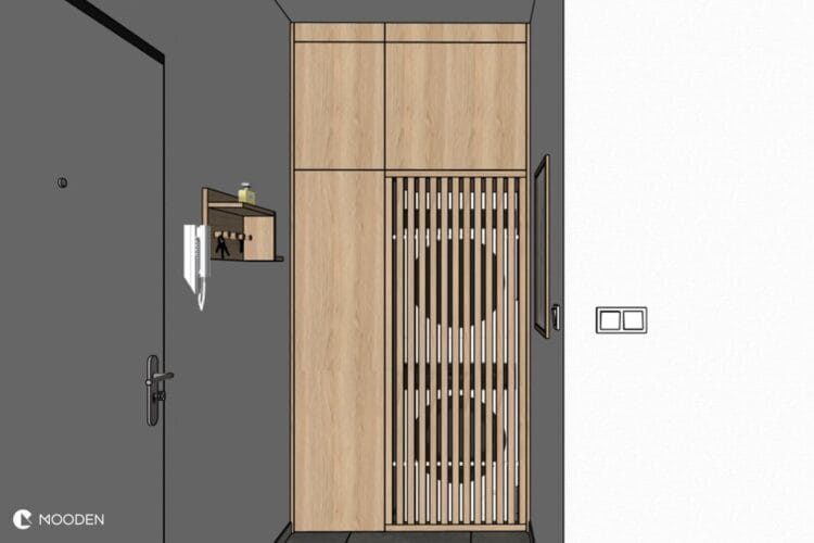 Vstupní zádveří jsme navrhli jako praktický a přehledný prostor, pračka a sušička jsou chytře ukryty ve skříni s posuvnými dveřmi. Úložné prostory na obuv, věšákový panel, lavička a zrcadlo zajišťují pohodlí i vizuální rovnováhu.
