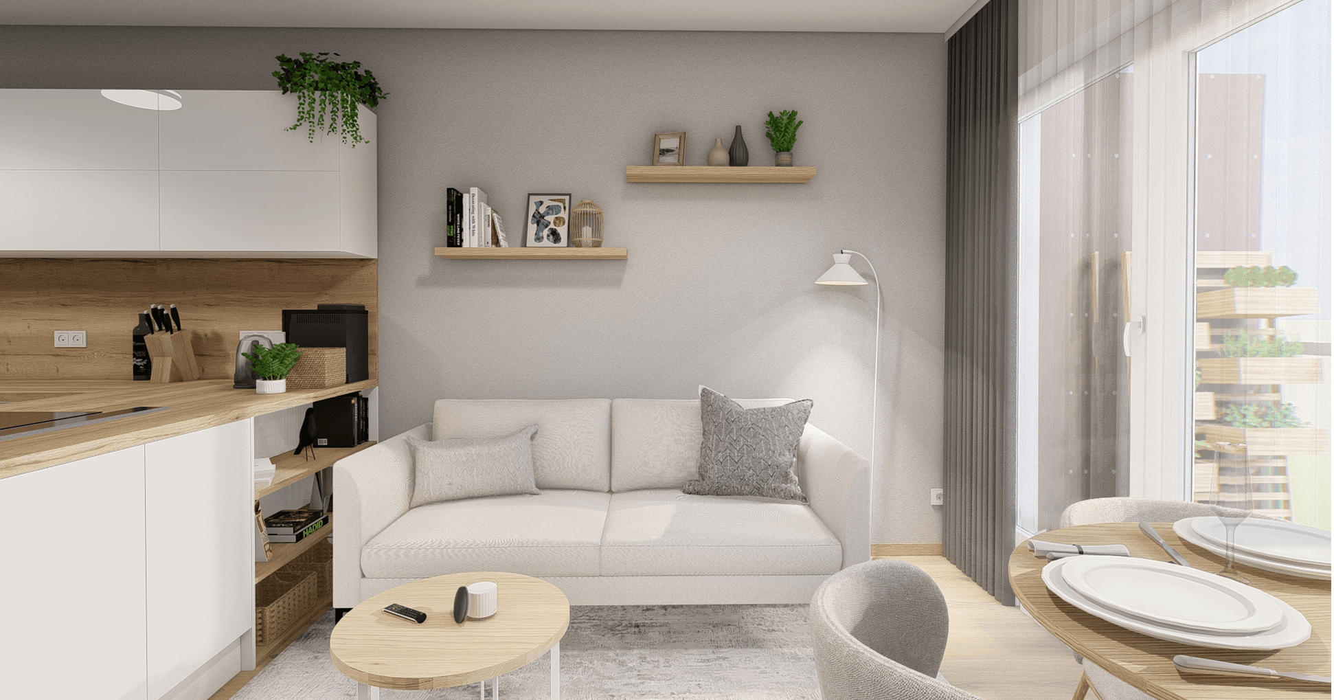V obytné kuchyni jsme na přání klientky jsme zachovali původní kuchyňskou linku, doplnili TV skříňku se skrytým vedením kabeláže a navrhli jídelní kout s důrazem na volnost pohybu. Neutrální tóny nábytku prostor příjemně sjednocují.