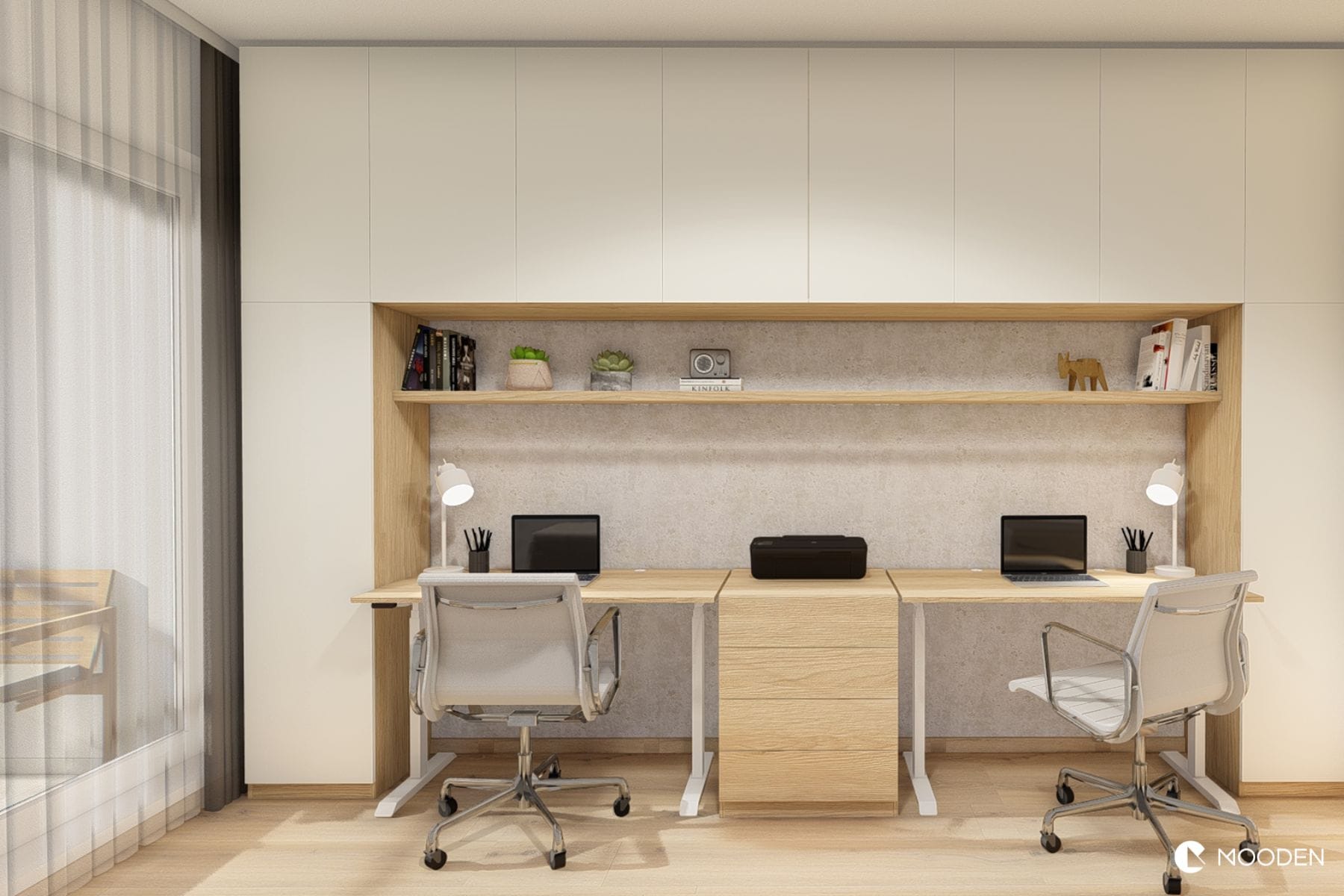 Pracovna je určena pro dvě osoby. Pracovní stoly jsou umístěny vedle sebe, orientované ke stěně naproti vstupu. Oba jsou výškově nastavitelné a doplněné o bohaté úložné řešení. Nechybí ani komoda a knihovna a rozkládací pohovka pro příležitostné přespání