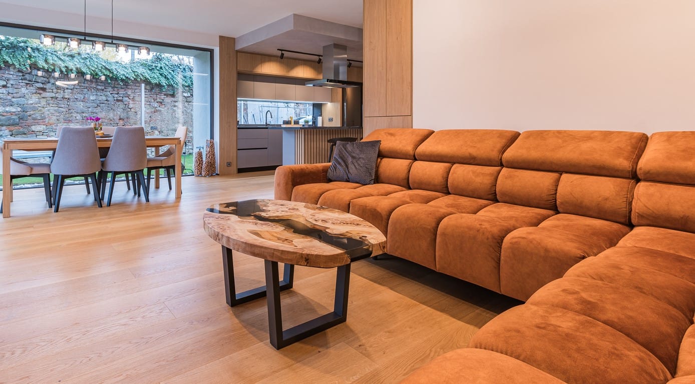 Obývací prostor je elegantní a zároveň útulný. Zvolili jsme sedačku v trochu neobvyklé, měděné barvě, která prostor nejen rozzářila, ale zároveň podtrhla použité dřevodekorové prvky. V případě TV sestavy bylo třeba myslet na nutnost uložení elektroniky a kabelů. Mezi požadavky klientů patřilo také to, abychom návrh interiéru tvořili s přihlédnutím k využívání robotického vysavače.