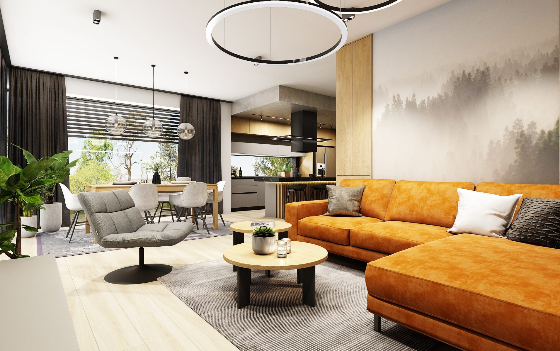 Centrální místností je obývací prostor propojený s kuchyní a jídelnou. Místnosti dominují velká, bezrámová okna, která zajišťují dostatek světla, a díky kterým se takřka stírá rozdíl mezi interiérem a exteriérem. Tento dojem jsme ještě podtrhli využitím světlých dřevodekorových prvků v interiéru. V návrhu jsme na stěnách a stropech použili betonovou stěrku, kterou zjemňují prvky v dřevodekoru.