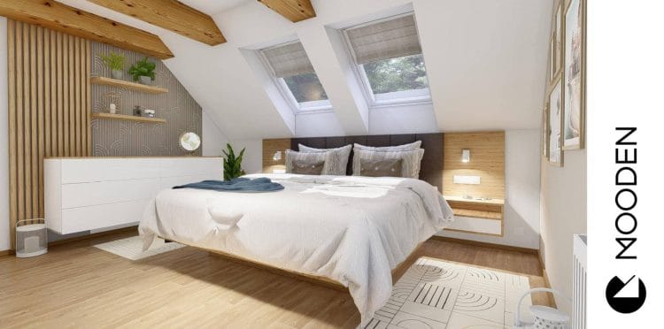 Ložnice je oázou klidu a relaxace. Využívá jemných tónů, které doplňují dřevěné prvky, což vytváří pocit tepla a pohody. Středobodem ložnice je levitující postel s pohodlným čalouněným čelem. Moderní, ale jednoduchý nábytek společně s kvalitním osvětlením a textiliemi podtrhují celkový dojem luxusu a pohodlí.