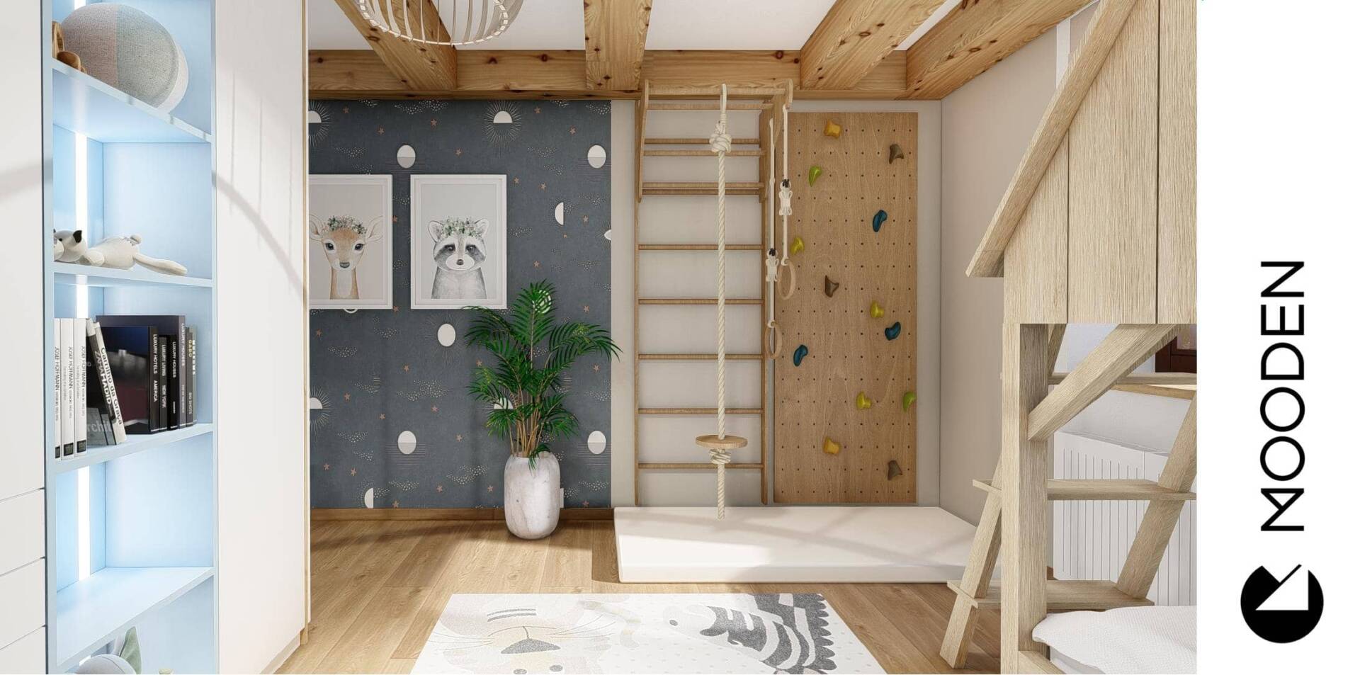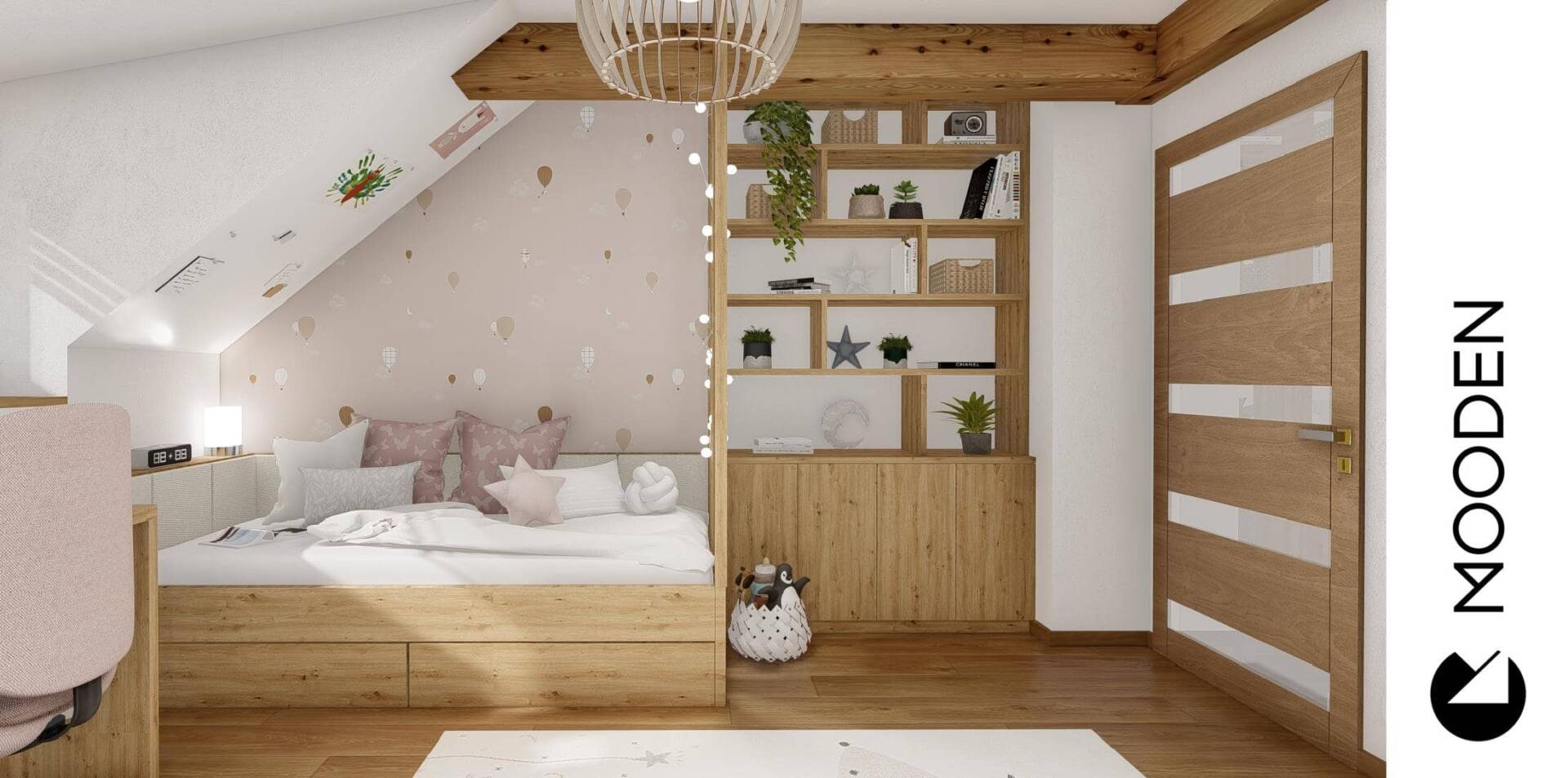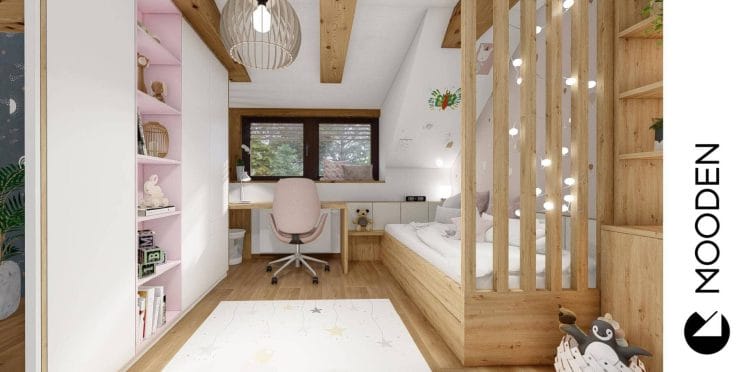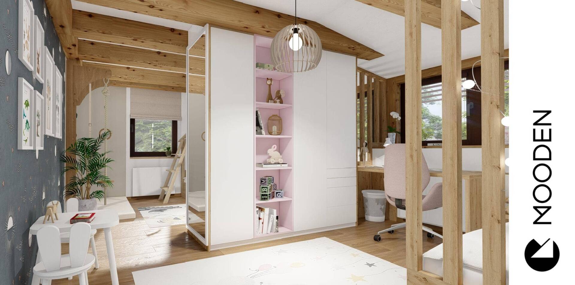 Dětský pokoj je veselým a kreativním prostorem, který respektuje individuální potřeby a zájmy obou dětí. Barevné akcenty, tapety s dětskými motivy a originální designové prvky vytvářejí zábavné a stimulující prostředí, aniž by bylo narušeno celkové harmonické schéma domu. Dívčí a chlapeckou část pokoje od sebe částečně dělí modulární nábytková stěna a lamelová příčka přisazená k okennímu rámu. Děti mají pokoj společný, ale přesto má každý z nich svůj malý soukromý koutek jen pro sebe. Modrá chlapecká část pokoje je vybavena malým sportovištěm s lezeckou stěnou, ta dívčí část je, jak jinak, růžově něžná.