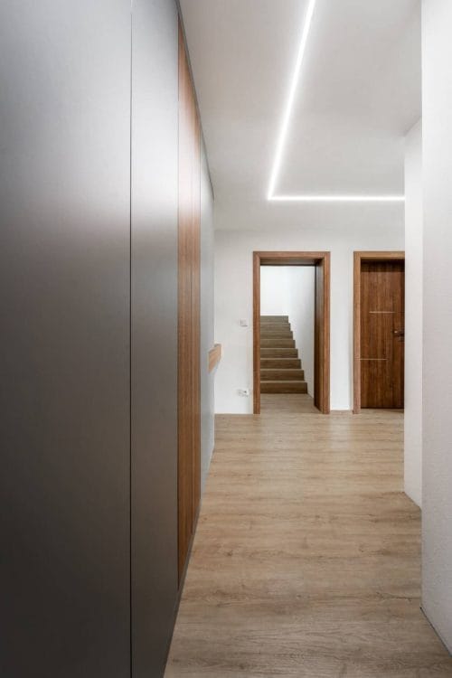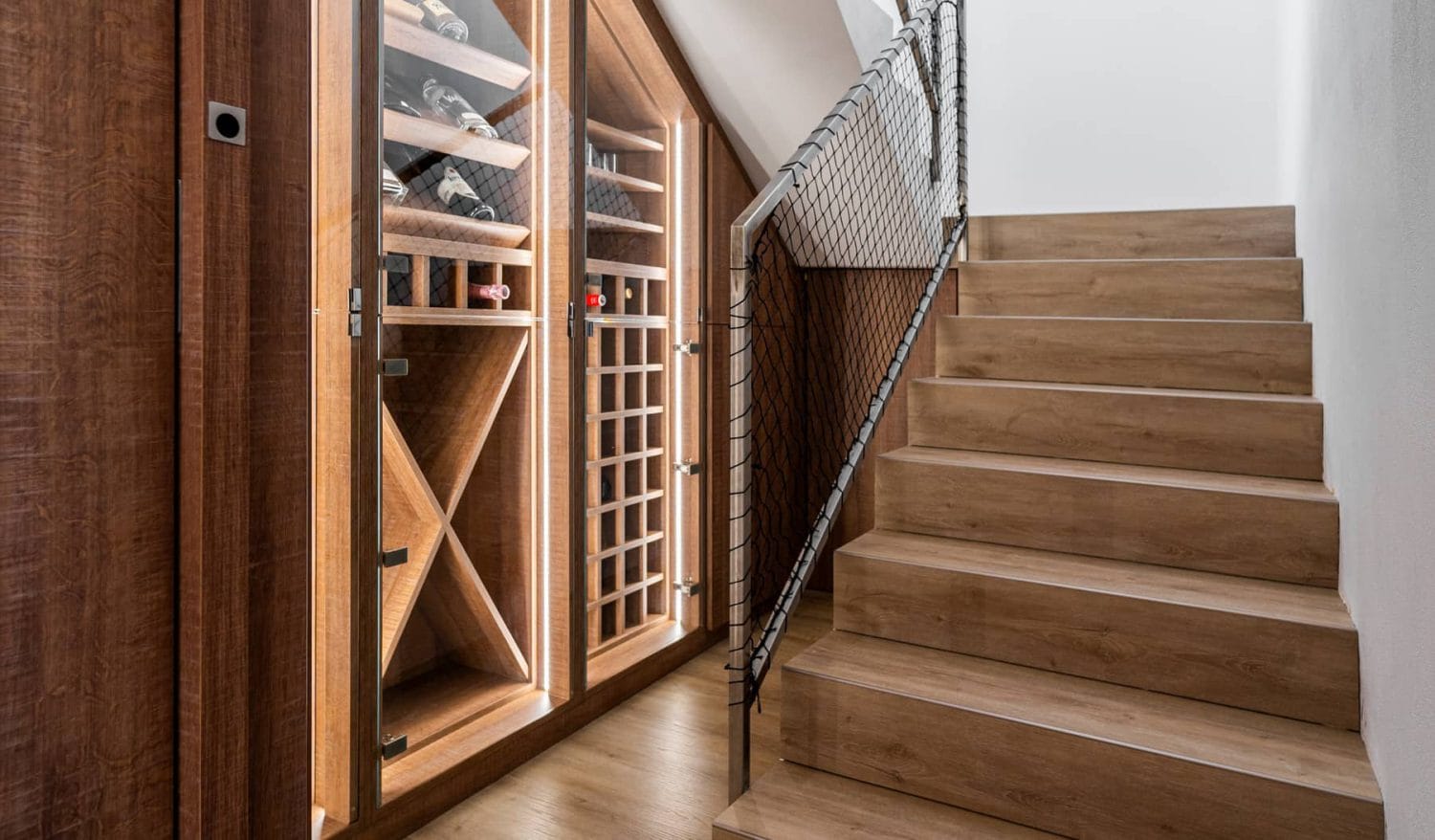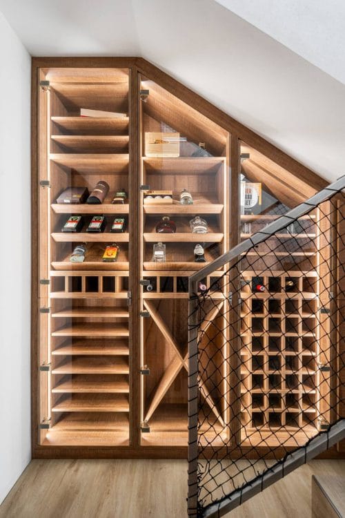 Pod schodištěm jsme umístili vestavnou vinotéku, která se stala výraznou designovou dominantou prostoru. Díky vnitřnímu systému polic a prosvětlení vynikla a přilákala pozornost. Vinotéka slouží nejen jako praktické úložné místo, ale také jako esteticky příjemný prvek.
