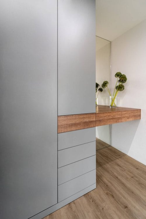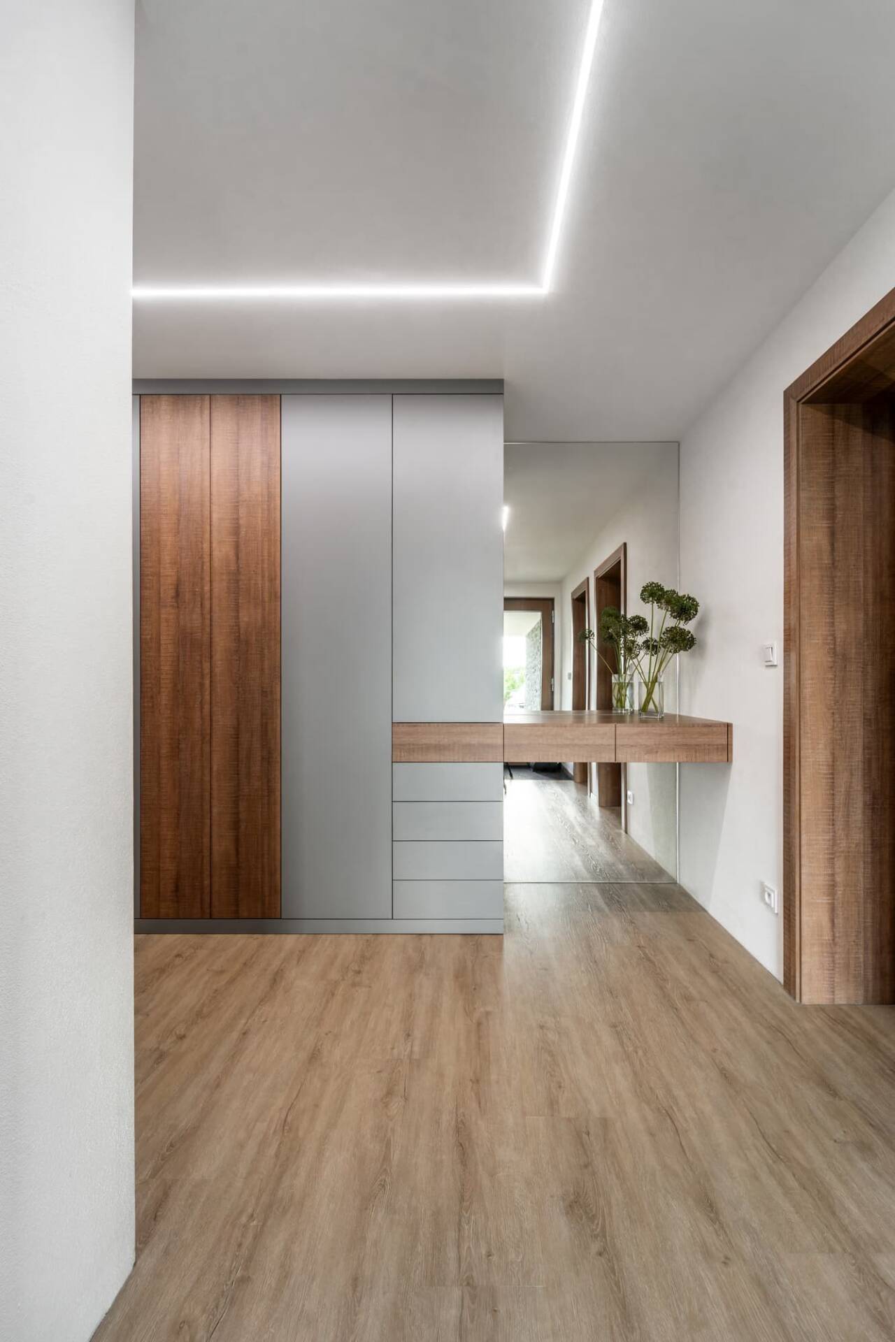 V předsíni jsme pro klienty navrhli prostornou vestavnou skříň, kterou doplňuje navazující stolek se zrcadlem. Naším cílem bylo zajistit maximum úložného prostoru, což byl jeden z hlavních požadavků klientů.
