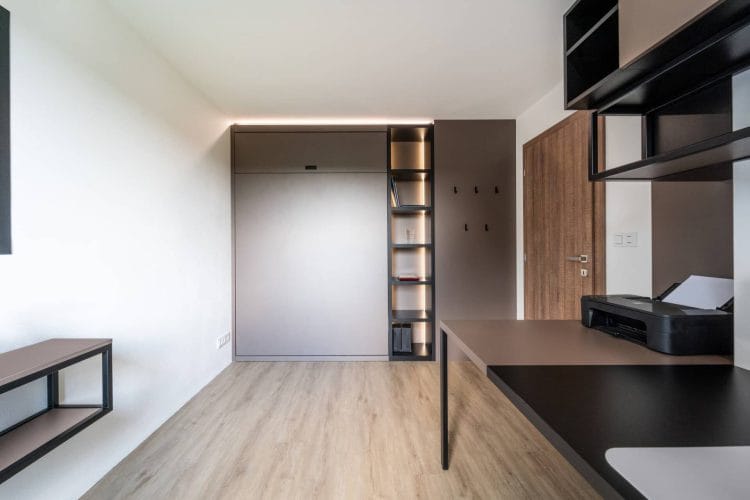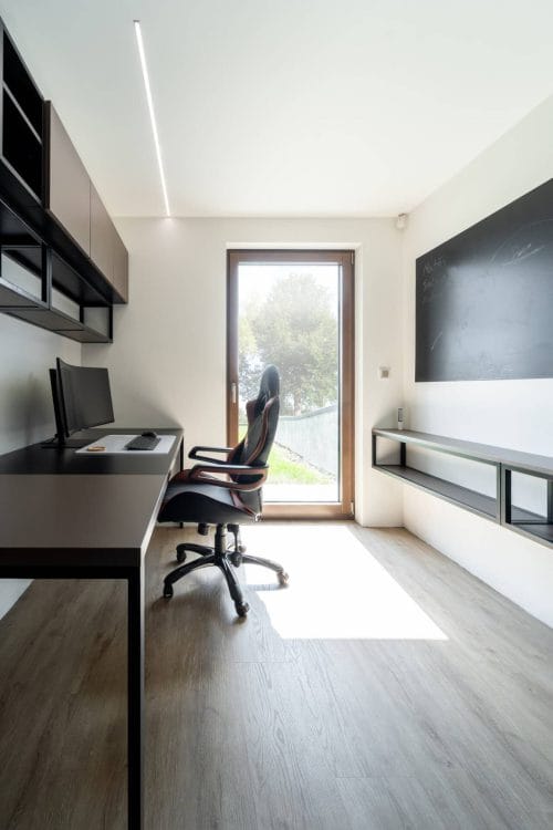 Domácí pracovna je multifunkčním prostorem, slouží jako zázemí pro home office a příležitostně jako pokoj pro hosty. Hlavním prvkem je skrytá výklopná postel, která poskytuje dostatek místa pro hosty, a zároveň nenarušuje prostor v pracovně. Tato pracovna je navržena s důrazem na eleganci a obsahuje veškeré vybavení potřebné pro efektivní práci z domova – kvalitní pracovní stůl, úložné skříňky i zdravotní kancelářské křeslo. Díky dostatku světla a úchvatnému výhledu do zahrady si majitelé mohou vychutnávat krásné výhledy během pracovního dne, což dodává domácí pracovně příjemnou atmosféru.