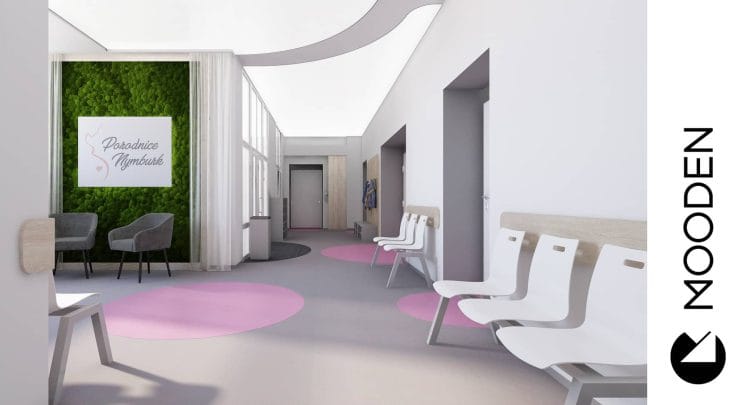 Součástí návrhu byl také interiér chodby mezi apartmány. Na chodbu jsme umístili fotokoutek s pozadím ve formě mechového obrazu a nezbytným logem porodnice. Každá maminka si může z porodnice odnést na památku fotografie, které jí budou připomínat první dny jejího miminka.