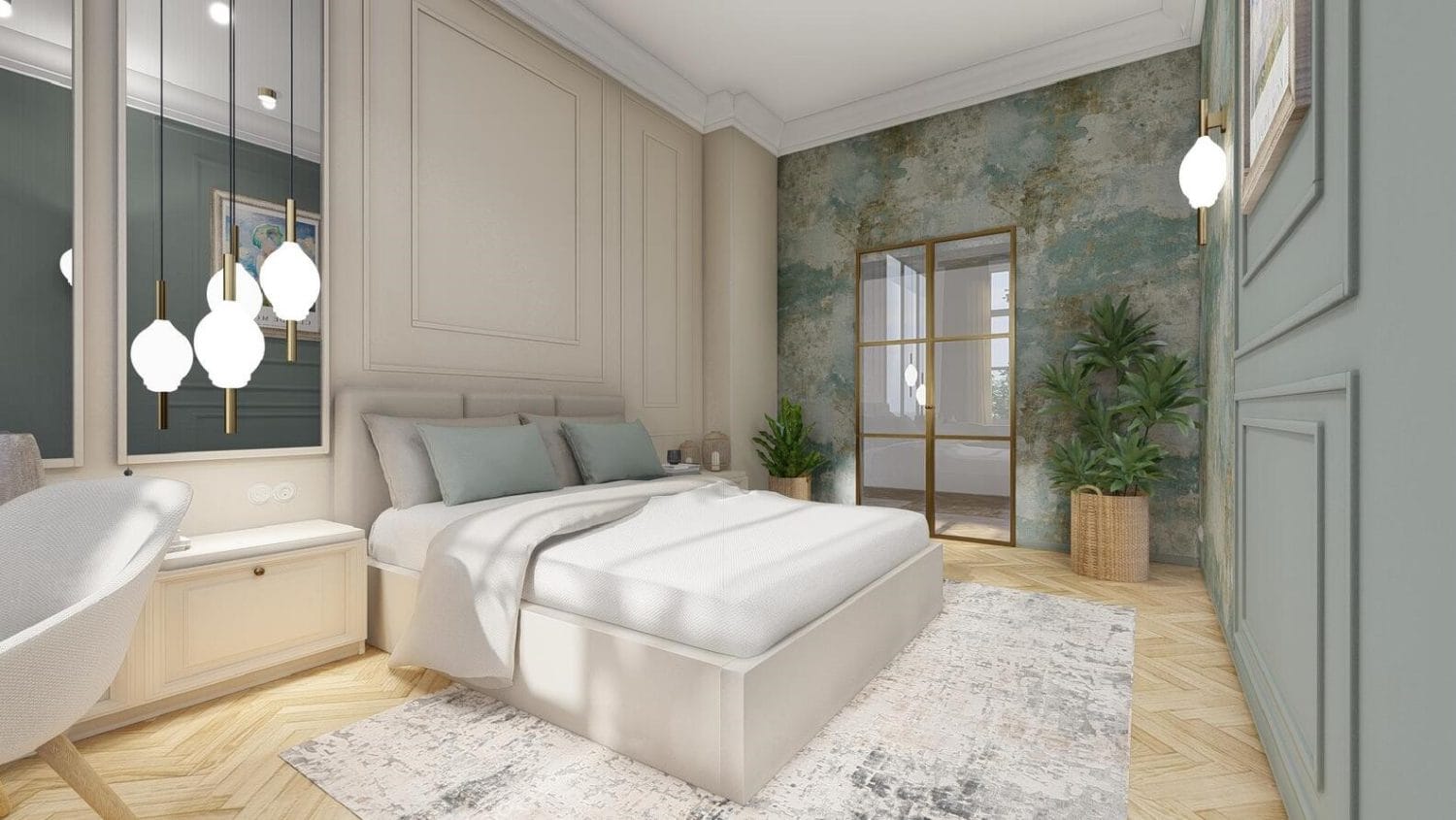 Dominantním prvkem jsou vestavěné skříně na míru, které poskytují dostatek úložného prostoru, ale také důmyslně skrývají vchod do koupelny. Tyto skříně mají dvířka v barvě slonové kosti nebo jsou opatřeny zrcadlovými panely, tedy nejen vizuálně zvětšují prostor.