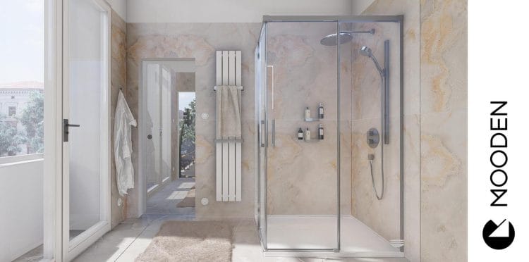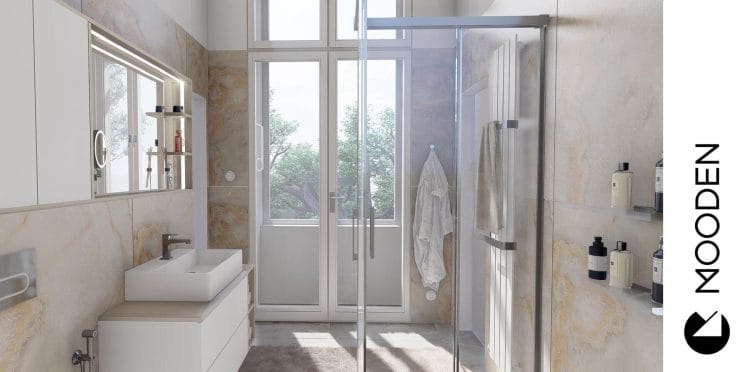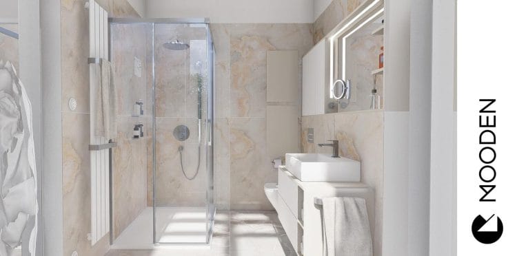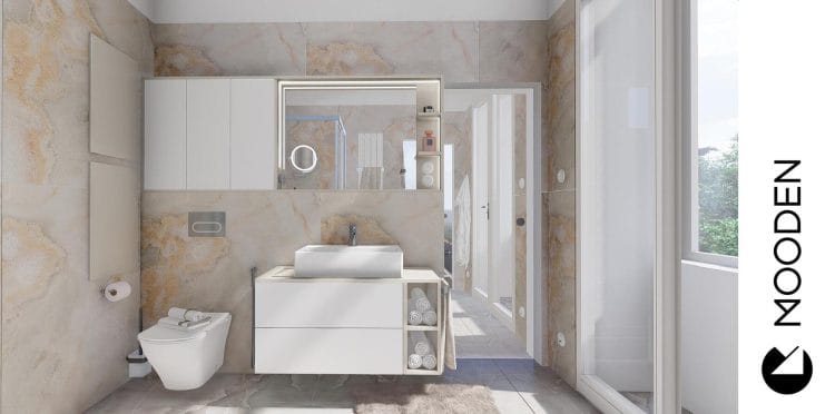 Koupelna tohoto bytu je čistě moderní. Nádech luxusu jí dodává především velkoformátová dlažba v imitaci mramoru Calacatta se zlatavými žilkami. Sprchový kout bez vaničky přispívá k minimalistickému a otevřenému charakteru místnosti, zatímco hranaté umyvadlo na stylové skříňce podtrhuje moderní estetiku.