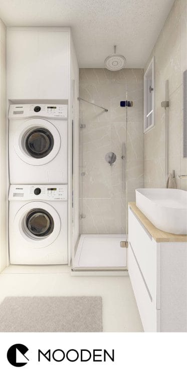 Malá předsíň i koupelna vyžadovaly obzvlášť promyšlené řešení, aby byly nejen funkční, ale i vizuálně přitažlivé. V předsíni jsme umístili vestavěnou šatní skříň s dostatkem místa pro uložení oblečení a obuvi celé rodiny. Koupelna, přestože je miniaturní, nabízí veškerý komfort, včetně sprchového koutu a pračky i sušičky umístěné ve vestavěné skříni.