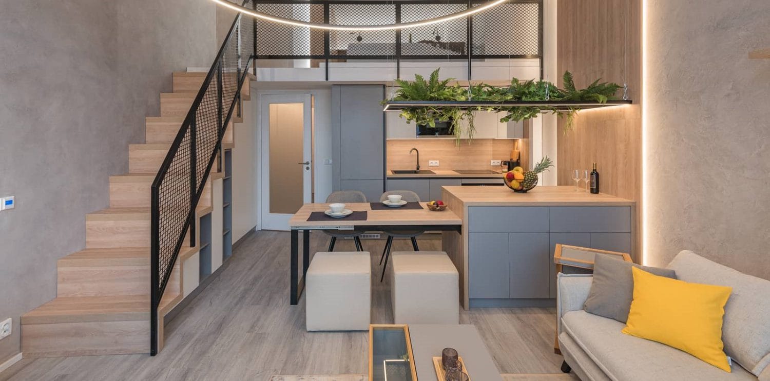 Vysoký strop v místnosti přímo vyzývá k výstavbě mezonetu, tedy vytvoření otevřeného mezipatra, díky kterému malá místnost vypadá mimořádně vzdušně a otevřeně. Garsonka s vysokým stropem a mezonetovým uspořádáním poskytuje jedinečný prostor plný možností. Jednou z výhod mezonetu také je, že v otevřeném prostoru zajišťuje částečné soukromí, v našem případě se přímo nabízí k vybudování ložnice.