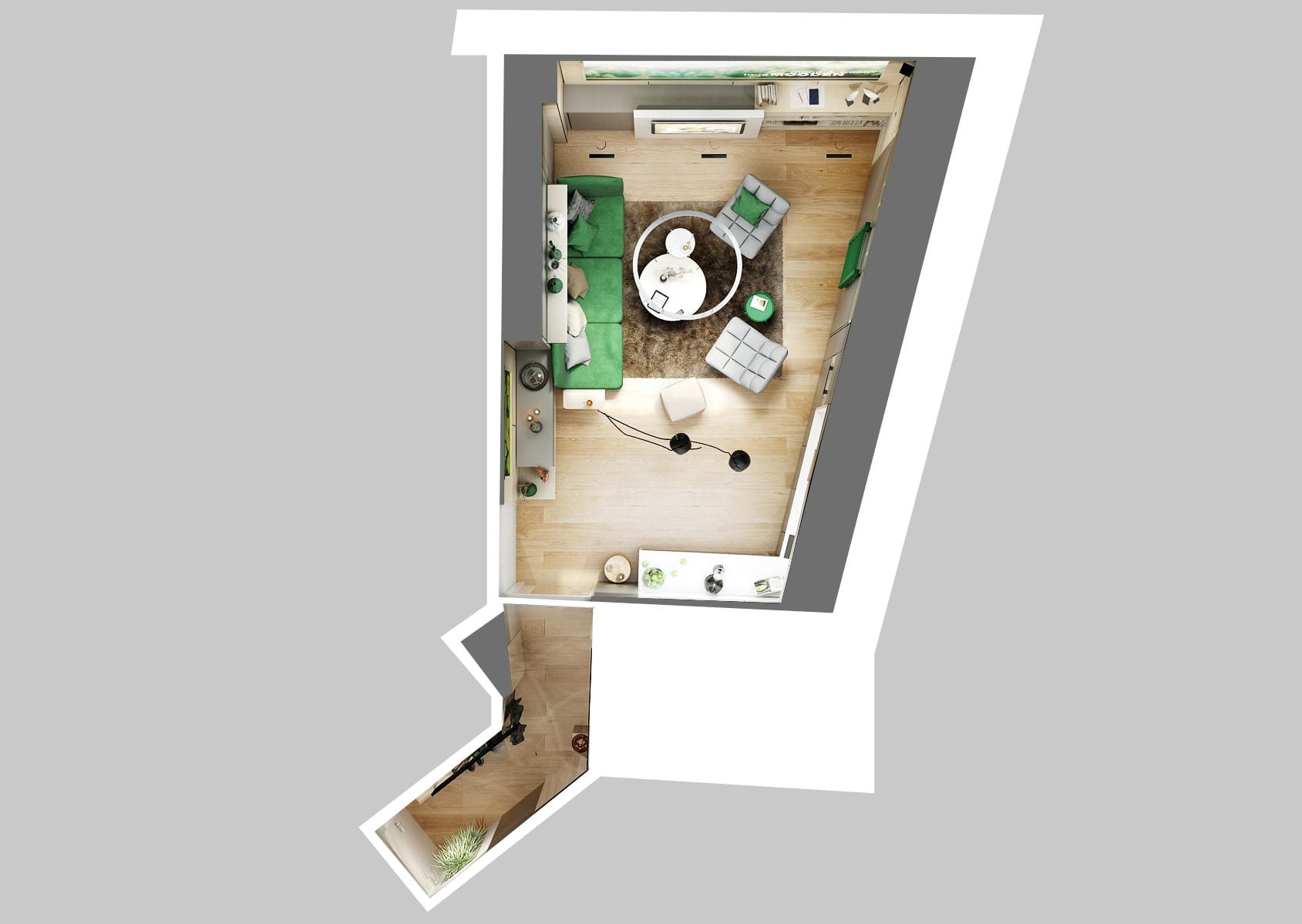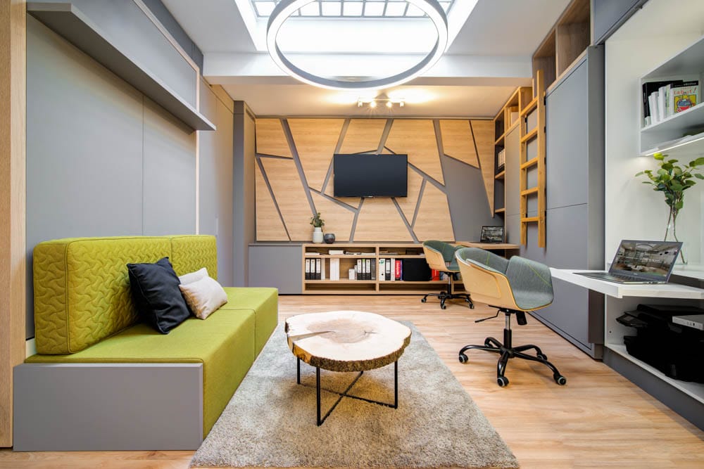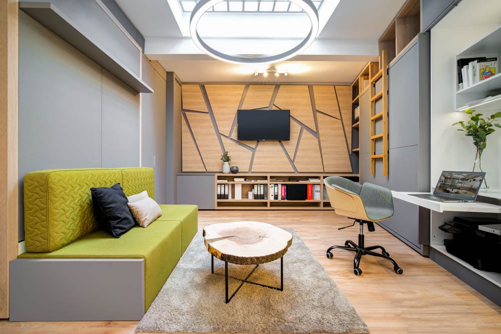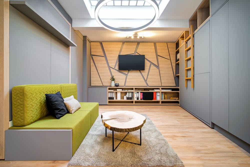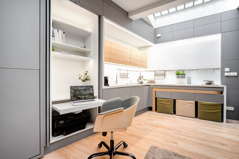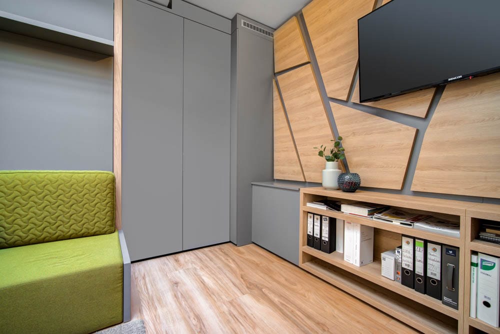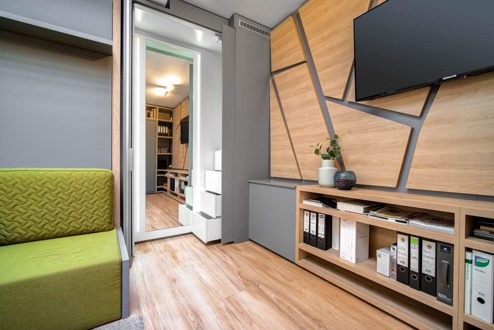 Na první pohled by se mohlo zdát nemožné vměstnat tolik funkcí do takto malého prostoru, ale díky promyšlenému konceptu a chytrým prostorovým řešením působí interiér otevřeně, přehledně a vzdušně.