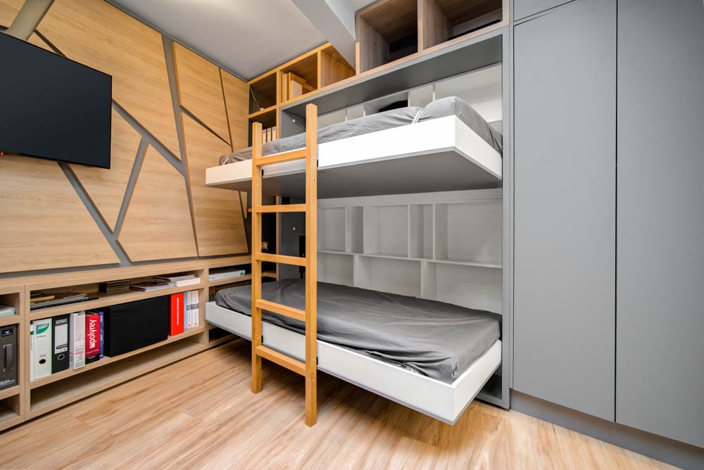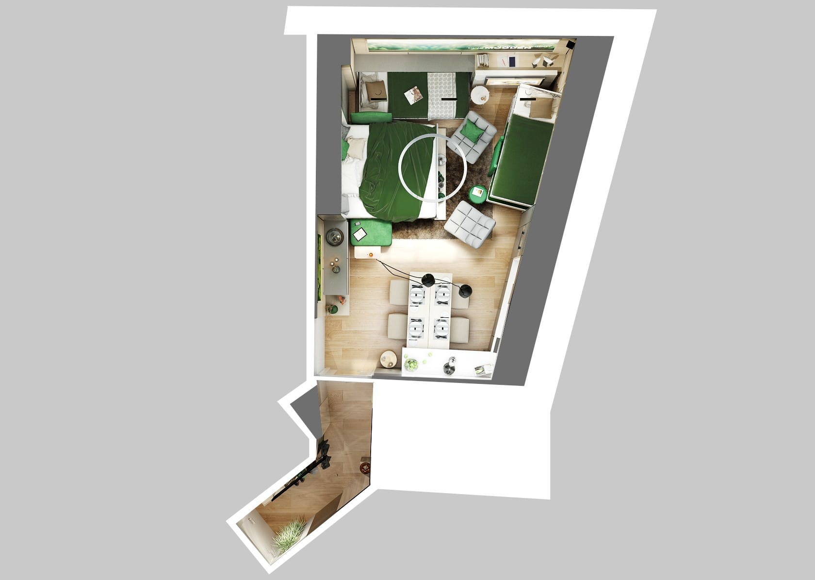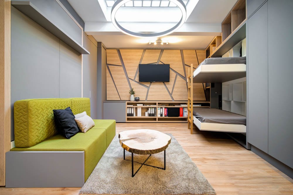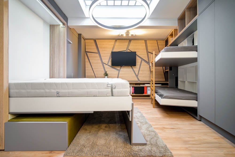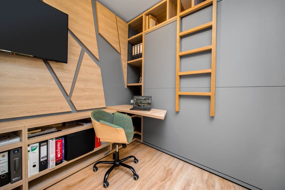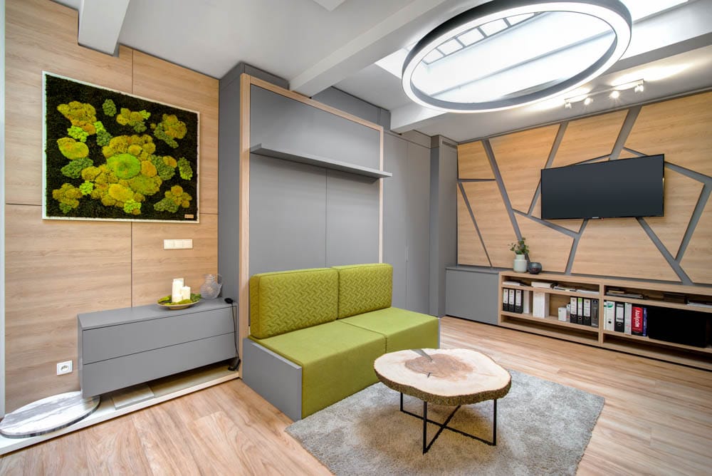 Chytré řešení interiéru této garsonky dokazuje, že i na ploše pouhých 27 m² lze vytvořit plnohodnotné a pohodlné bydlení. V rámci návrhu se nám podařilo do prostoru umístit čtyři plnohodnotná lůžka, kompletní kuchyňskou linku, jídelní stůl pro čtyři osoby, dvě pracovní místa, šatnu i multifunkční nábytek v obývací části.