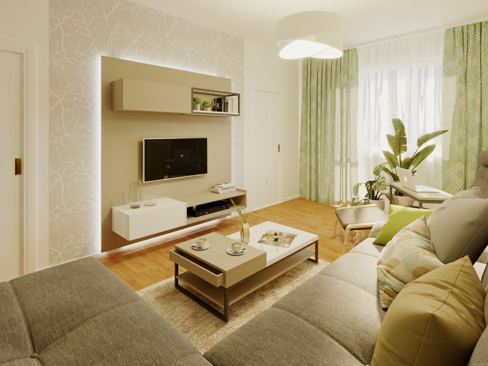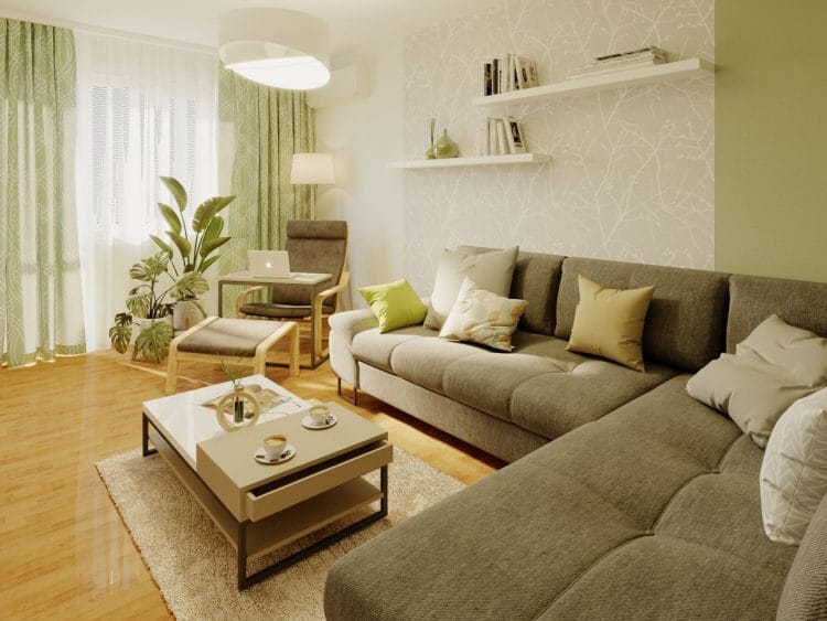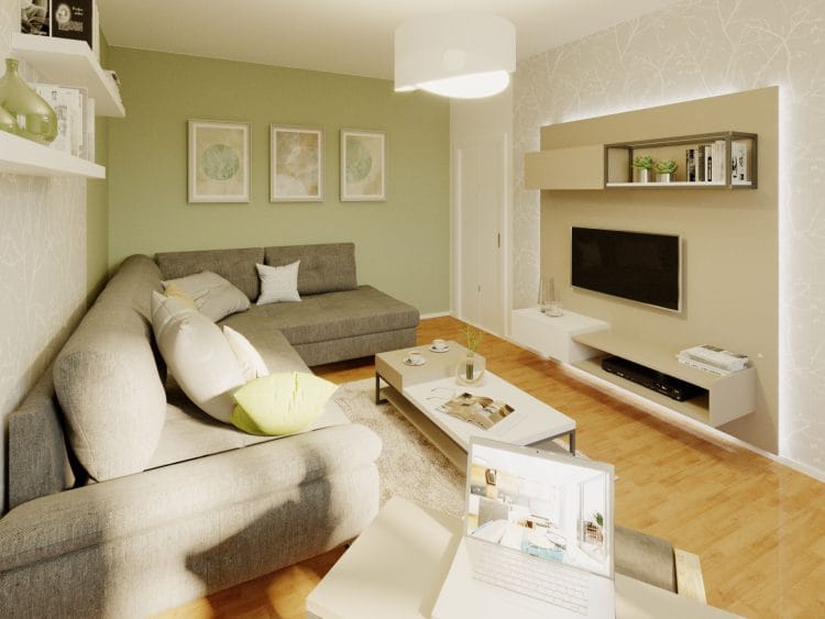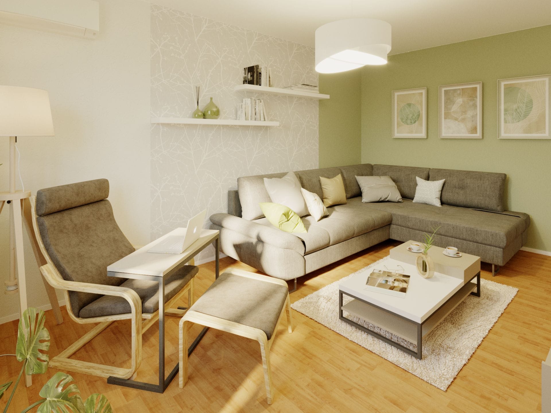 Vizualizace interiéru obývacího pokoje o velikosti 18 m² vznikla na přání klientů, kteří chtěli vyhradit samostatný pokoj pro babičku a zařídit jej tak, aby se zde cítila co nejpohodlněji.