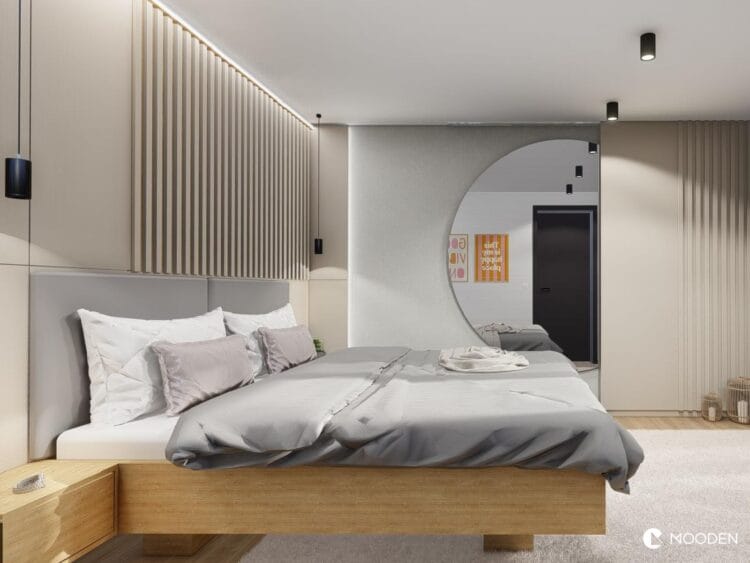 V ložnici si klientka přála mít co nejméně věcí na očích. Levitující postel působí odlehčeně, jako by se vznášela nad podlahou. Naproti ní jsme navrhli posuvný obklad, za kterým se skrývá televize a velké kulaté zrcadlo – záleží jen na tom, co bude chtít mít zrovna  před sebou.