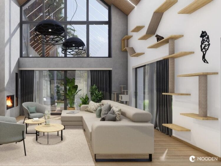 Nešlo jen o to, aby interiér dobře vypadal. Důležité bylo, aby v něm bylo příjemně – lidem i jejich čtyřnohým parťákům. V obývacím pokoji proto vznikla lezecká stěna pro kočky, která zabírá celou jednu stěnu. Je navržena tak, aby ladila se zbytkem interiéru a zároveň nabídla dost prostoru pro šplhání, odpočinek i pozorování dění v místnosti.