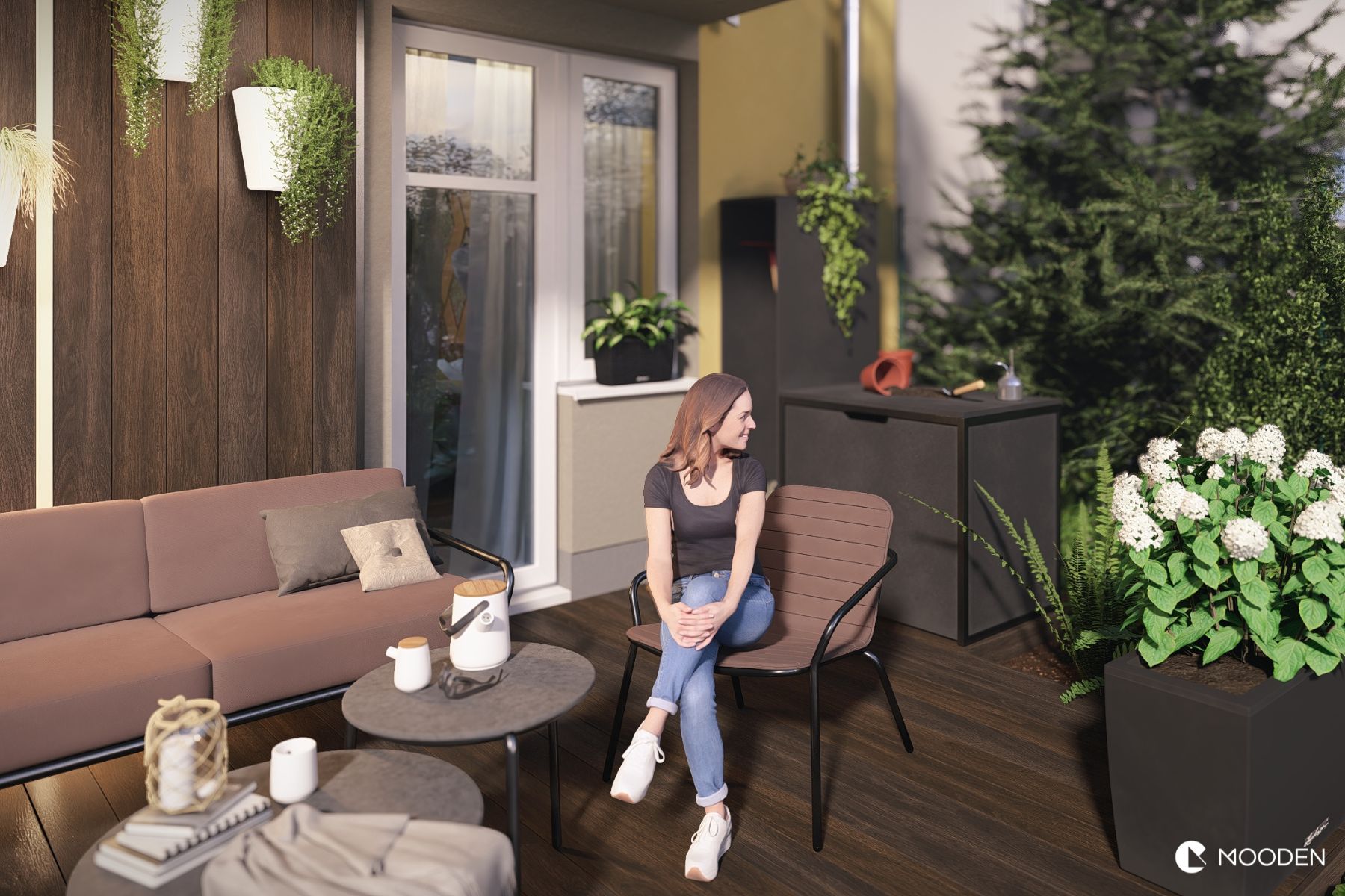 Návržený nábytek je jednoduchý, odolný a navržený přímo pro venkovní použití. Dvě křesla, sedačka a stolek tvoří kompaktní posezení, tmavší odstíny nábytku ladí s podlahou a podtrhují přirozený vzhled terasy.