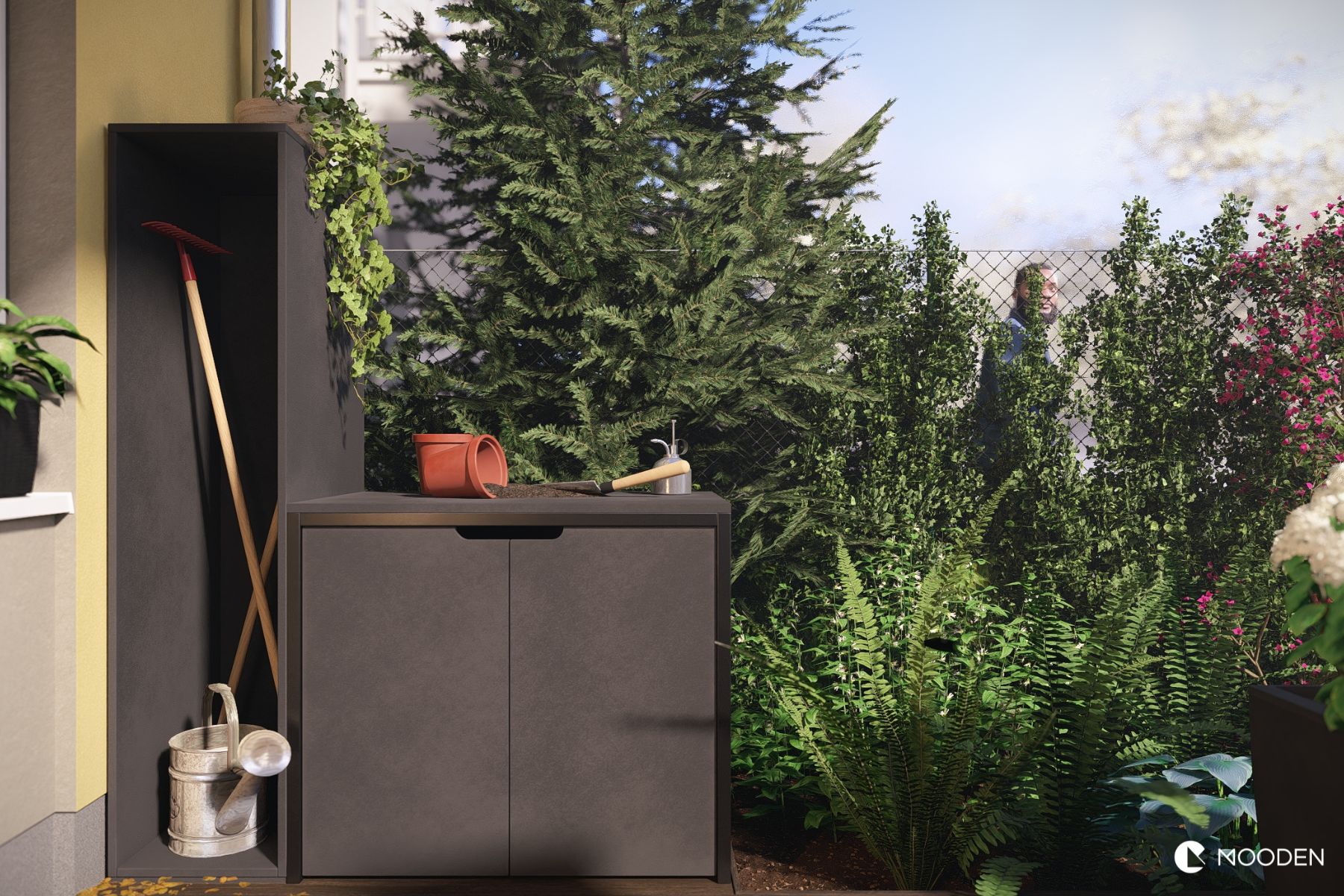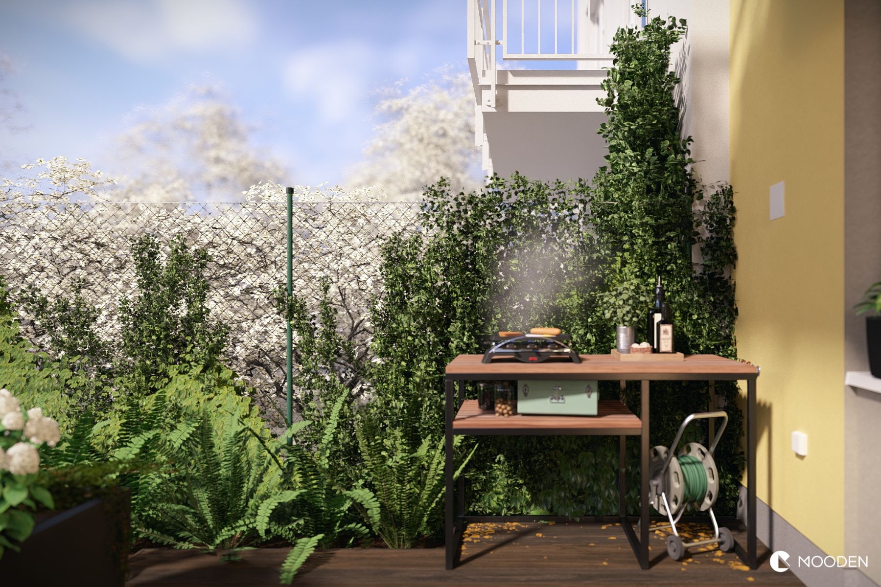 Součástí návrhu je i grilovací koutek s elektrickým grilem a dostatkem místa pro přípravu jídla. Vše je řešeno tak, aby terasa působila uspořádaně a otevřeně. Nevzhledné technické detaily jako kohoutek a zahradní hadice jsou nenápadně skryté, ale zůstávají snadno přístupné. Nechybí ani praktické úložné prostory na nářadí nebo skládací sekačku.