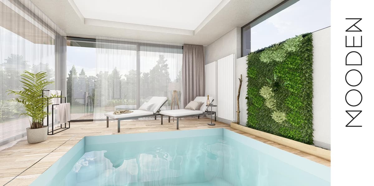 Prostornou a vzdušnou bazénovou halu v přízemí rodinného domu, pro který jsme před nedávnem připravili řešení celého interiéru, jsme navrhli v přírodním stylu. Na podlahu jsme použili keramickou dlažbu v imitaci dřeva v kombinaci se světlými velkoformátovými obklady. Dominantu interiéru tvoří dvě živé zelené stěny. Součástí návrhu je také vybavení zázemí – toalety a sprchového koutu, a to včetně sanity a koupelnového nábytku. Celý prostor bazénu zútulňují textilie ve smetanových barvách.