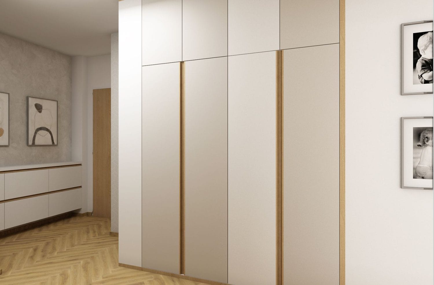 Barevná paleta je laděná do bílé, taupe a tónů světlého dřeva. Díky těmto kombinacím působí interiér útulně, elegantně a zároveň lehce, což zádveří přetváří v reprezentativní vstupní prostor bytu.