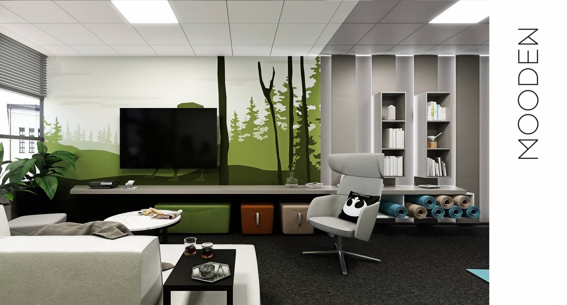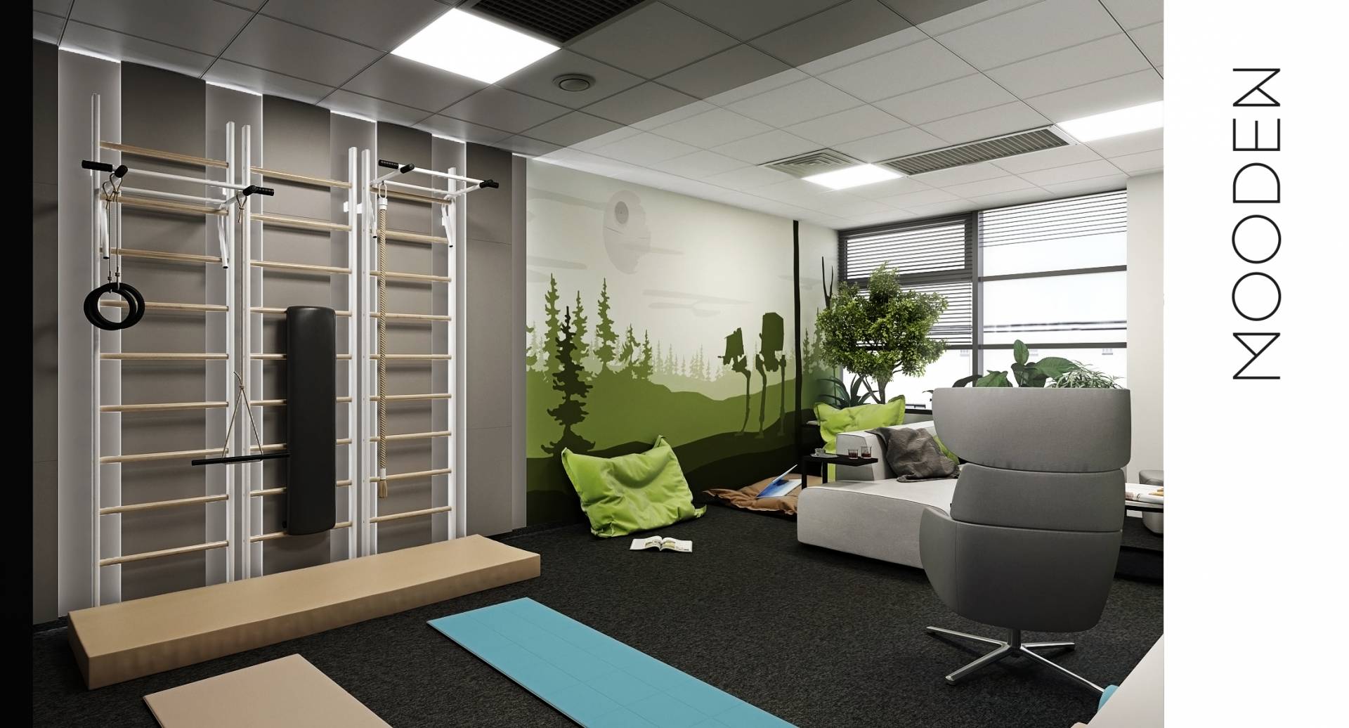 Aktivní i pasivní odpočinek během několikahodinové práce u počítače je v dnešní době nezbytný. Odpočívat u čtení zpráv nebo projíždění nových postů na sociálních sítích není to pravé ořechové, člověk si ve skutečnosti neodpočine a jeho mozek už vůbec ne. Důsledkem je pak častá bolest hlavy, nesoustředění a významně snížená efektivita práce. Umožněte svým zaměstnancům pauzu v místnosti, která bude tomu určená. Kde se budou moci projít, protáhnout, vyčistit hlavu, pobavit s kolegy. Perfektní by byl i přístup ven (na dvůr, balkon či terasu). Na zeď volte jemnější a veselé tóny, skvělá bude jemně žlutá, která má blahodárný vliv na nervový systém, povzbudí koncentraci, přinese uvolnění, navodí pocit harmonie a radosti, také by měla podpořit tvůrčí schopnost. Podobně příjemné jsou i zelené, uklidňující stěny.